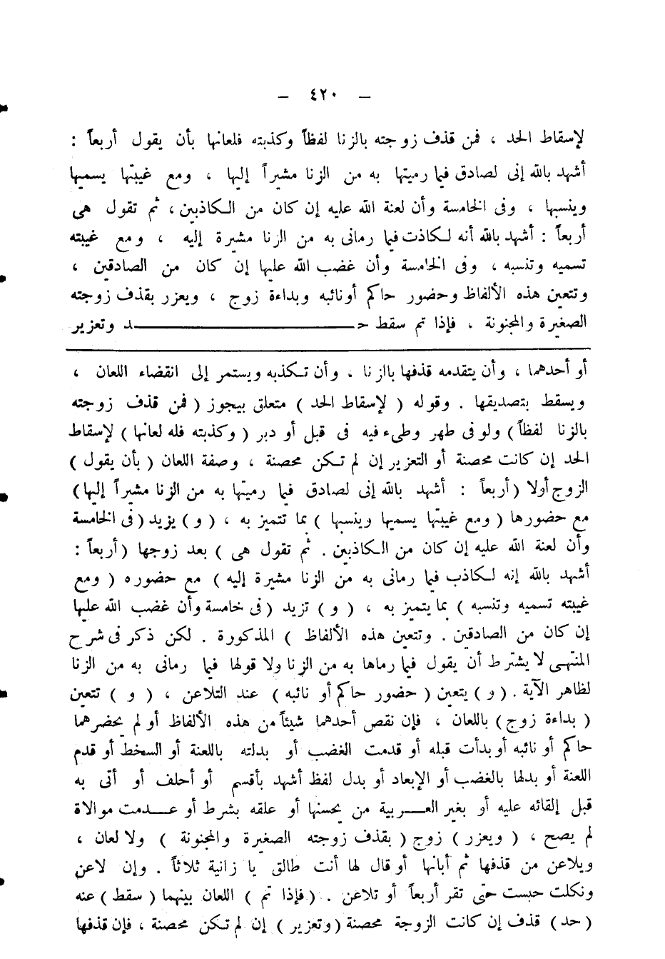 لإسقاط الحد، فمن قذف زوجته بالزنا لفظًا وكذبته فلعانها بأن يقول أربعًا: أشهد بالله أني لصادق فيما رميتها به من الزنا مشيرًا إليها، ومع غيبتها يسميها وينسبها، وفي الخامسة وأن لعنة الله عليه إن كان من الكاذبين. ثم تقول هي أربعًا: أشهد بالله إنه لكاذب فيما رماني به من الزنا مشيرة إليه، ومع غيبته تسميه وتنسبه، وفي الخامسة وأن غضب الله عليها إن كان من الصادقين. وتتعين هذه الألفاظ وحضور حاكم أو تائبه وبداءة زوج، ويعزر بقذف زوجته الصغيرة والمجنونة. فإذا تم سقط حد وتعزير
