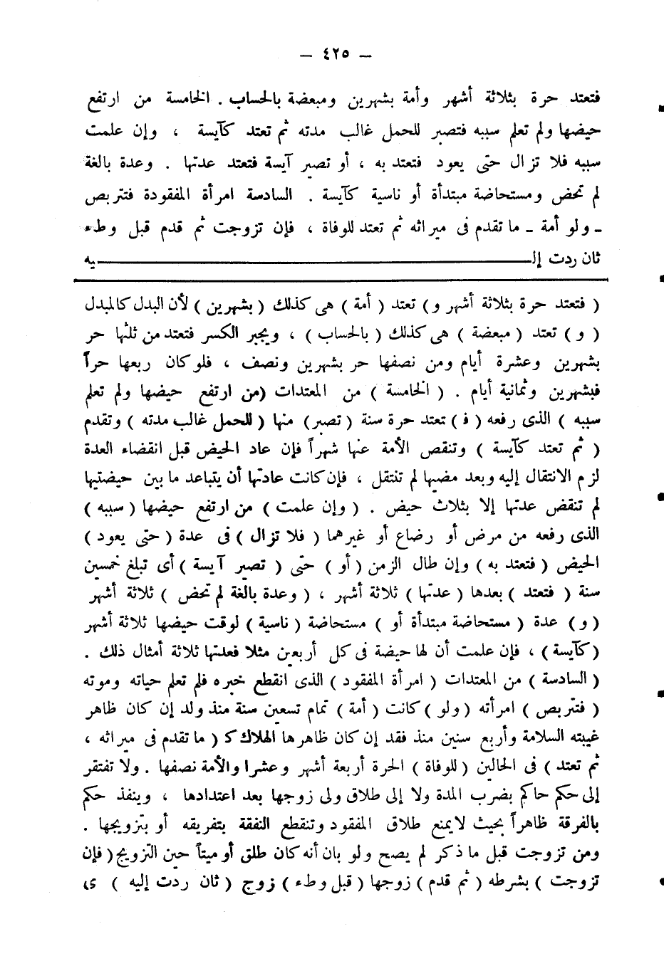 فتعتد حرة بثلاثة أشهر وأمة بشهرين ومبعضه بالحساب، الخامسة من ارتفع حيضها ولم تعلم سببه فتصبر للحمل غالب مدته ثم تعتد كآيسة، وإن علمت سببه فلا تزال حتى يعود فتعتد به، أو تصير آيسة فتعتد عدتها. وعدة بالغة لم تحض ومستحاضة مبتدأة أو ناسية كآيسة. السادسة امرأة المفقود فتتربص -ولو أمة- ما تقدم في ميراثه ثم تعتد للوفاة، فإن تزوجت ثم قد قبل وطء ثان ردت إليه