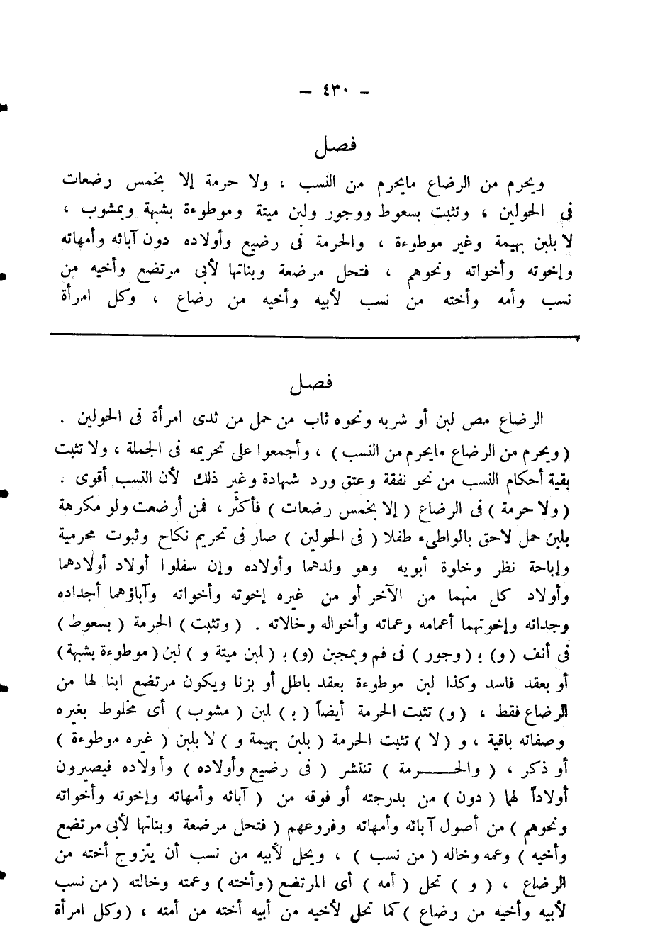 فصل ويحرم من الرضاع ما يحرم من النسب، ولا حرمة إلا بخمس رضعات في الحولين، وتثبت بسعوط ووجور ولبن ميتة وموطوءة بشبهة وبمشوب، لا بلبن بهيمة وغير موطوءة، والحرمة في رضيع وأولاده دون آبائه وأمهاته وإخوته وأخواته ونحوهم، فتحل مرضعة وبناتها لأبي مرتضع وأخيه من نسب وأمه وأخته من نسب لأبيه وأخيه من رضاع، وكل امرأة