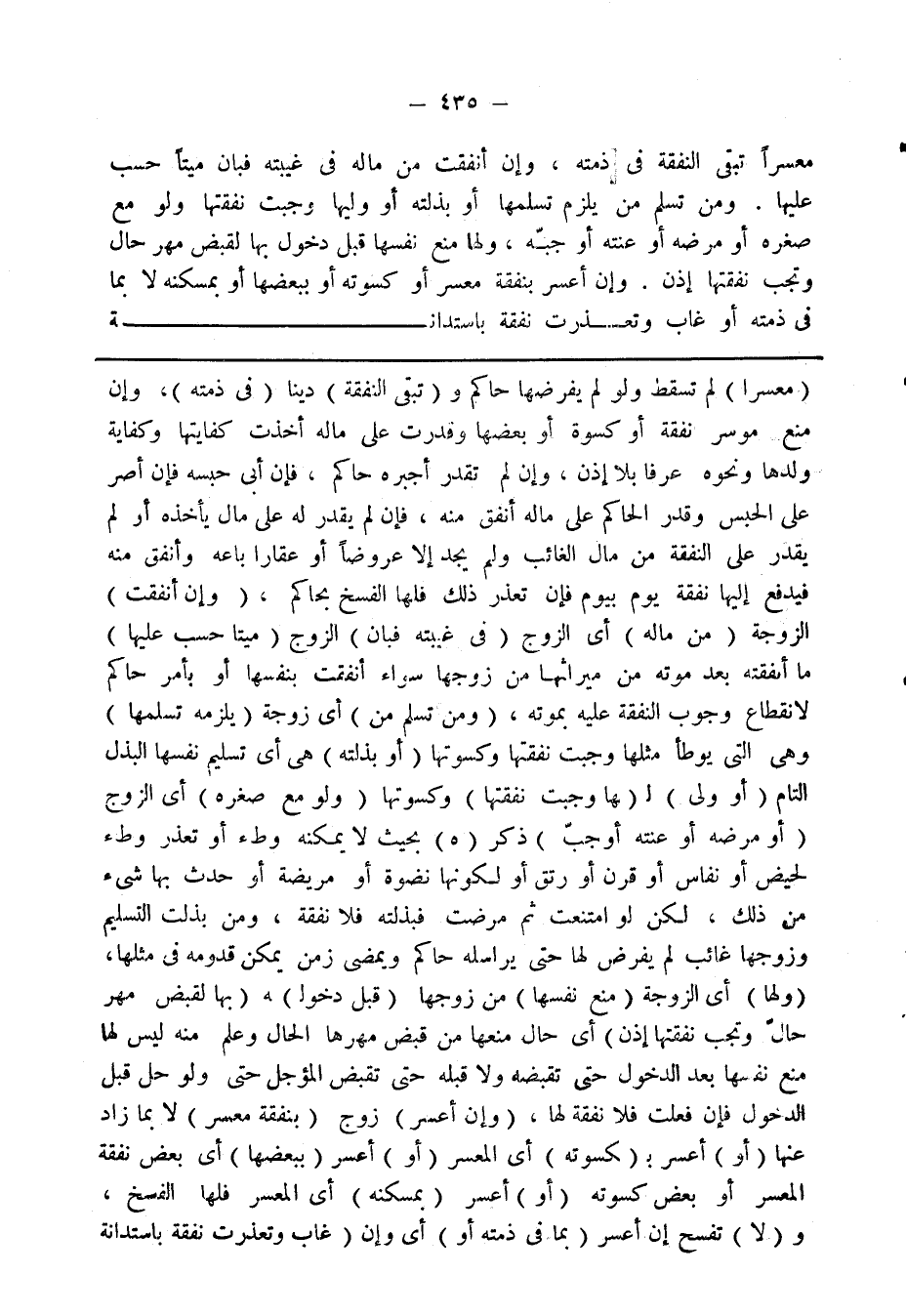 (معسرًا) لم تسقط ولو لم يفرضها حاكم و (تبقى النفقة) دينا (في ذمته)، وإن منع موسر نفقة أو كسوة أو بعضها وقدرت على ماله أخذت كفايتها وكفاية ولدها ونحوه عرفا بلا إذن، وإن لم تقدر أجبره حاكم، فإن أبى حبسه فإن أصر على الحبس وقدر الحاكم على ماله أنفق منه، فإن لم يقدر له على ماله يأخذه أو لم يقدر على النفقة من مال الغائب ولم يجد إلا عروضا أو عقارا باعه وأنفق منه فيدفع إليها نفقة يوم بيوم فإن تعذر ذلك فلها الفسخ بحاكم، (وإن أنفقت) الزوجة (من ماله) أي الزوج (في غيبته فإن) الزوج (ميتا حسب عليها) ما أنفقته بعد موته من ميراثها من زوجها سواء أنفقت بنفسها أو بأمر حاكم لانقطاع وجوب النفقة عليه بموته، (ومن تسلم من) أي زوجة (يلزمه تسلمها) وهي التي يوطأ مثلها وجبت نفقتها وكسوتها (أو بذلته) هي أن تسليم نفسها البذل التام (أو ولى) لـ (ـها وجبت نفقتها) وكسوتها (ولو مع صغره) أي الزوج (أو مرضه أو عنته أو جبّ) ذكر (هـ) بحيث لا يمكنه وطء أو تعذر وطء لحيض أو نفاس أو قرن أو رتق أو لكونها نضوة أو مريضة أو حدث بها شيء من ذلك، لكن لو امتنعت ثم مرضت فبذلته فلا نفقة، ومن بذلت التسليم وزوجها غائب لم يفرض لها حتى يراسله حاكم ويمضى زمن يمكن قدومه في مثلها، (ولها) أي الزوجة (منع نفسها) من زوجها (قبل دخولـ) ـه (بها لقبض مهر حالّ وتجب نفقتها إذن) أي حال منعها من قبض مهرها الحال وعلم نه ليس لها منع نفسها بعد الدخول حتى تقبضه ولا قبله حتى تقبض المؤجل حتى ولو حل قبل الدخول فإن فعلت فلا نفقة لها، (وإن أعسر) زوج (بنفقة معسر) لا بما زاد عنها (أو) أعسر بـ (ـكسوته) أي المعسر (أو) أعسر (ببعضها) أي بعض نفقة المعسر أو بعض كسوته (أو) أعسر (بمسكنه) أي المعسر فلها الفسخ، و (لا) تفسخ إن أعسر (بما في ذمته أو) أي وإن (غاب وتعذرت نفقة باستدانة