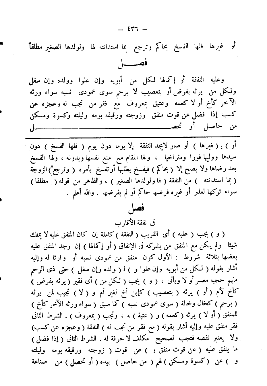 (و) يجب (عليه) أي القريب (النفقة) كاملة إن كان المنفق عليه لا يملك شيئا ولم يكن مع المنفق من يشركه في الإنفاق (أو إكمالها) إن وجد المنفق عليه بعضها بثلاثة شروط: الأول كون منفق من عمودي نسبه أو وارثا له وإليه أشار بقوله (لكل من أبويه وإن علوا و) لـ (ولده وإن سفل) حتى ذي الرحم منهم حجبه معسر أو لا ويأتي، (و) يجب (لكل من) أي فقير (يرثه بفرض) كأخ لأم (أو) يرثه (بتعصيب) كإبن أخ لغير أم و (لا) تجب لمن يرثه (برحم) كخال وخالة (سوى عمودي نسبه) كما سبق (سواء ورثه الآخر كأخ) للمنفق (أو لا) يرثه (كعمه) و (عتيقـ) ـه، وتجب (بمعروف). الشرط الثاني فقر منفق عليه وإليه أشار بقوله (مع فقر من تجب له) النفقة (وعجزه عن كسب) ولا يعتبر نقصه فتجب لصحيح مكلف لا حرفة له. الشرط الثاني (إذا فضل) ما ينفق عليه (عن قوت منفق و) عن قوت (زوجته ورقيقه يومه وليلته و) عن (كسوة ومسكن) لهم (من حاصل) بيده (أو تحصل) من صناعة