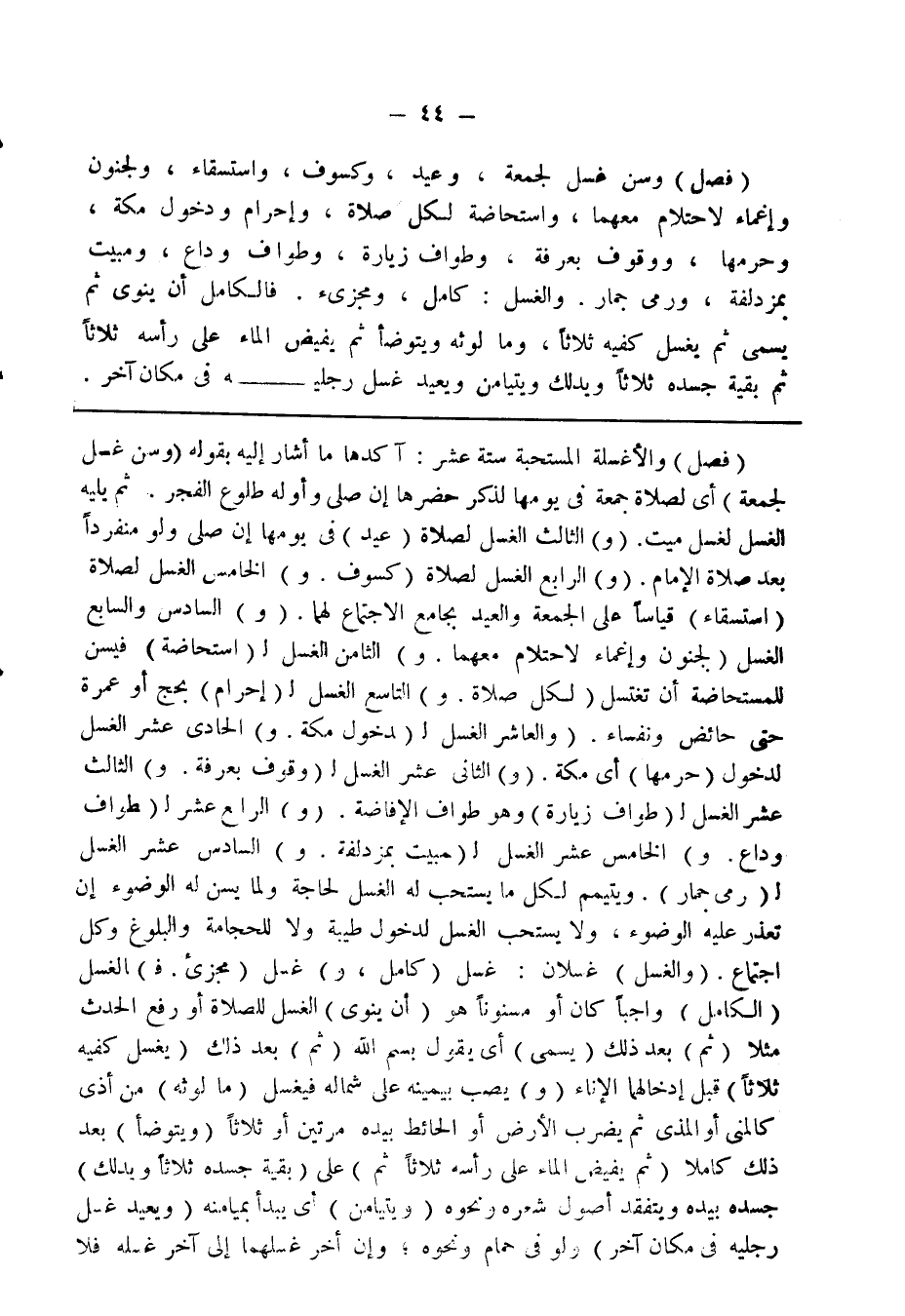 (فصل) والأغسلة المستحبة ستة عشر: آكدها ما أشار إليه بقوله (وسن غسل لجمعة) أي لصلاة جمعة في يومها لذكر حضرها إن صلى وأوله طلوع الفجر، ثم يليه الغسل لغسل ميت، (و) الثالث الغسل لصلاة (عيد) في يومها إن صلى ولو منفردًا بعد صلاة الإمام، (و) الرابع الغسل لصلاة (كسوف. و) الخامس الغسل لصلاة (استسقاء) قياسًا على الجمعة والعيد بجامع الاجتماع لها. (و) السادس والسابع الغسل (لجنون وإغماء لاحتلام معهما. و) الثامن الغسل (لاستحاضة) فيسن للمستحاضة أن تغتسل (لكل صلاة. و) التاسع الغسل (لإحرام) بحج أو عمرة حتى حائض ونفساء، (و) العاشر الغسل (لدخول مكة. و) الحادي عشر الغسل لدخول (حرمها) أي مكة، (و) الثاني عشر الغسل (لوقوف بعرفة. و) الثالث عشر الغسل (لطواف زيارة) وهو طواف الإفاضة، (و) الرابع عشر (لطواف وداع، و) الخامس عشر الغسل (لمبيت بمزدلفة. و) السادس عشر الغسل (لرمي جمار)، ويتيمم لكل ما يستحب له الغسل لحاجة، ولما يسن له الوضوء إن تعذر عليه الوضوء، ولا يستحب الغسل لدخول طيبة ولا للحجامة والبلوغ وكل اجتماع، (والغسل) غسلان: غسل (كامل، و) غسل (مجزئ) فالغسل (الكامل) واجبًا كان أو مسنونًا هو (أن ينوي) الغسل للصلاة أو رفع الحدث مثلاً (ثم) بعد ذلك (يسمي) أي يقول بسم الله (ثم) بعد ذلك (يغسل كفيه ثلاثًا) قبل إدخالهما الإناء (و) يصب بيمنه على شماله فيغسل (ما لوثه) من أذى كالمني أو المذي ثم يضرب الأرض أو الحائط بيده مرتين أو ثلاثًا (ويتوضأ) بعد ذلك كاملاً (ثم يفيض الماء على رأسه ثلاثًا ثم) على (بقية جسده ثلاثًا ويدلك) جسده بيده ويتفقد أصول شعره ونحوه (ويتيامن) أي يبدأ بميامنه (ويعيد غسل رجليه في مكان آخر) ولو في حمام ونحوه، وإن أخر غسلهما إلى آخر غسله فلا