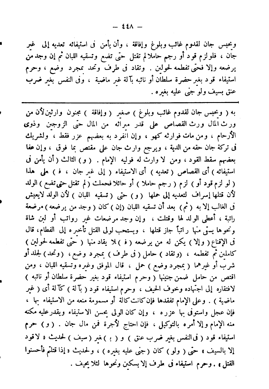 ويحبس جان لقدوم غائب وبلوغ وإفاقة. وأن يأمن في استيفائه تعديه إلى غير جان، فلو لزم قود أو رجم حاملا لم تقتل حتى تضع وتسقيه اللبان ثم إن وجد من يرضعه وإلا فحتى تفطمه لحولين. وتقاد في طرف وتحد بمجرد وضع. وحرم استيفاء قود بغير حضرة سلطان أو نائبة بآلة غير ماضية، وفي النفس بغير ضرب عنق بسيف ولو جنى عليه بغيره