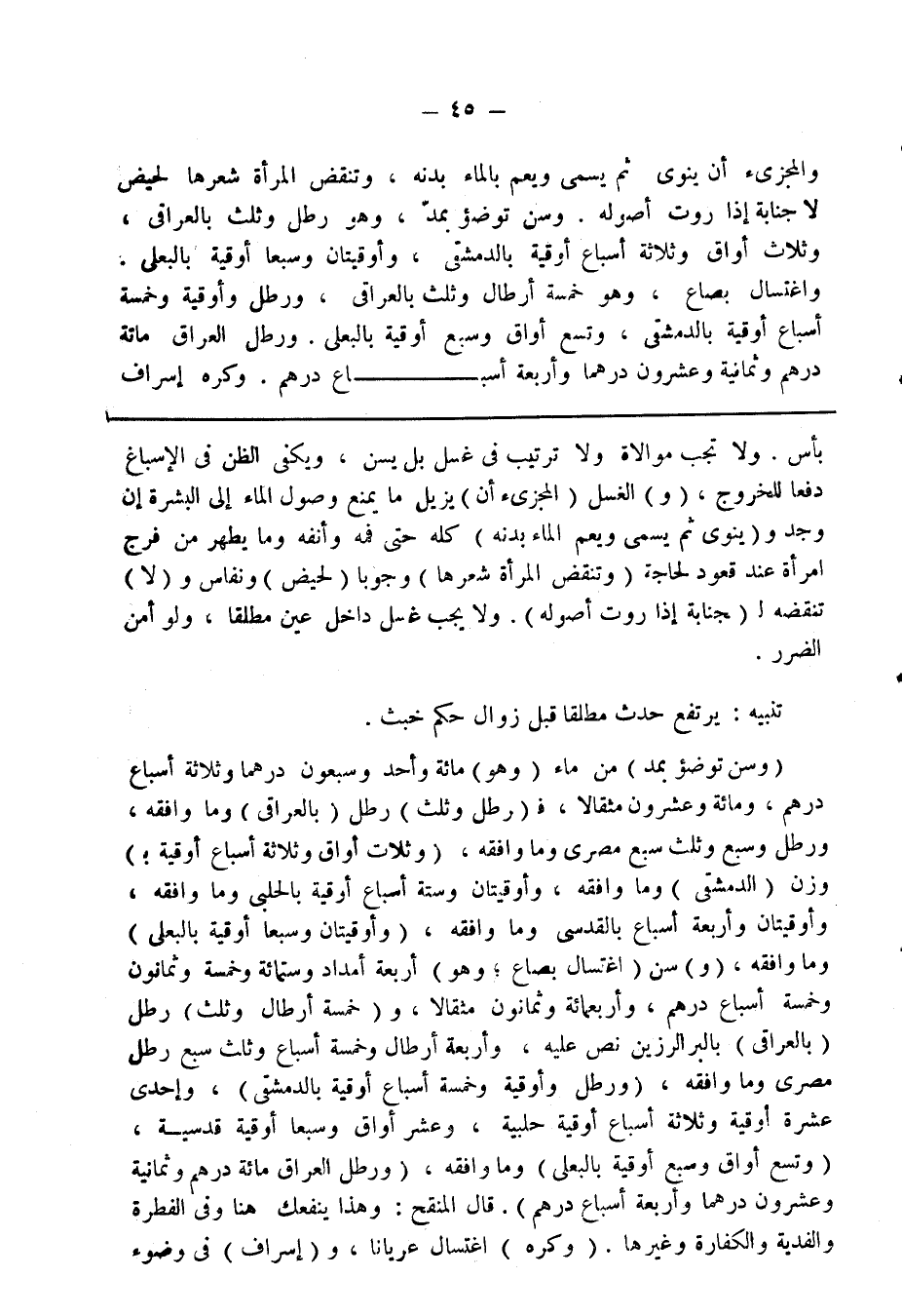 (وسن توضؤ بمد) من ماء (وهو) مائة وأحد وسبعون درهمًا وثلاثة أسباع درهم، ومائة وعشرون مثقالاً، (فرطل وثلث) رطل (بالعراقي) وما وافقه، ورطل وسبع وثلث سبع مصري وما وافقه، (وثلاث أواق وثلاثة أسباع أوقية) وزن (الدمشقي) وما وافقه، وأوقيتان وستة أسباع أوقية بالحلبي وما وافقه، وأوقيتان وأربعة أسباع بالقدسي وما وافقه، (وأوقيتان وسبعًا أوقية بالبعلي) وما وافقه، (و) سن (اغتسال بصاع، وهو) أربعة أمداد وستمائة وخمسة وثمانون وخمسة أسباع درهم وأربعمائة وثمانون مثقالاً، و (خمسة أرطال وثلث) رطل (بالعراقي) بالبر الرزين نص عليه، وأربعة أرطال وخمسة أسباع وثلث سبع رطل مصري وما وافقه، (ورطل وأوقية وخمسة أسباع أوقية بالدمشقي)، وإحدى عشرة أوقية وثلاثة أسباع أوقية حلبية، وعشر أوراق وسبعًا أوقية قدسية، (وتسع أواق وسبع أوقية بالبعلي) وما وافقه، (ورطل العراق مائة درهم وثمانية وعشرون درهمًا وأربعة أسباع درهم)، قال المنقح: وهذا ينفعك هنا، وفي الفطرة والفدية والكفارة وغيرها، (وكره) اغتسال عريانًا و (إسراف) في وضوء