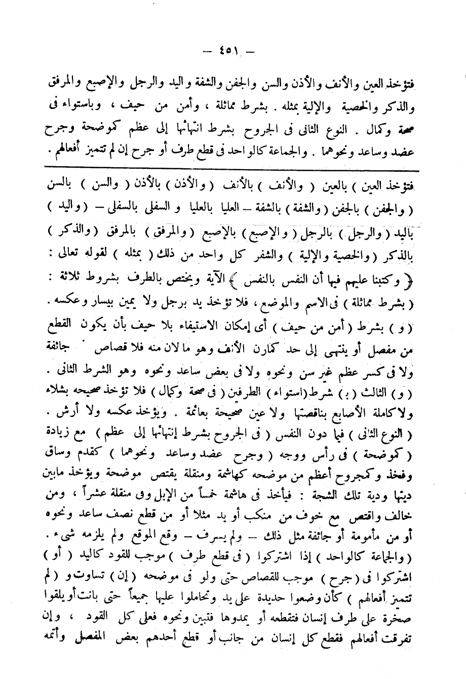 فتؤخذ العين والأنف والأذن والسن والجف والشفة واليد والرجل والإصبع والمرفق والذكر والخصية والآلية بمثله. بشرط مماثلة، وأمن من حيف، وباستواء في صحة وكمال. النوع الثاني في الجروح بشرط انتهائها إلى عظم كموضحة وجرح عضد وساعد ونحوهما. والجماعة كالواحد في قطع طرف أو جرح إن لم تتميز أفعالهم.