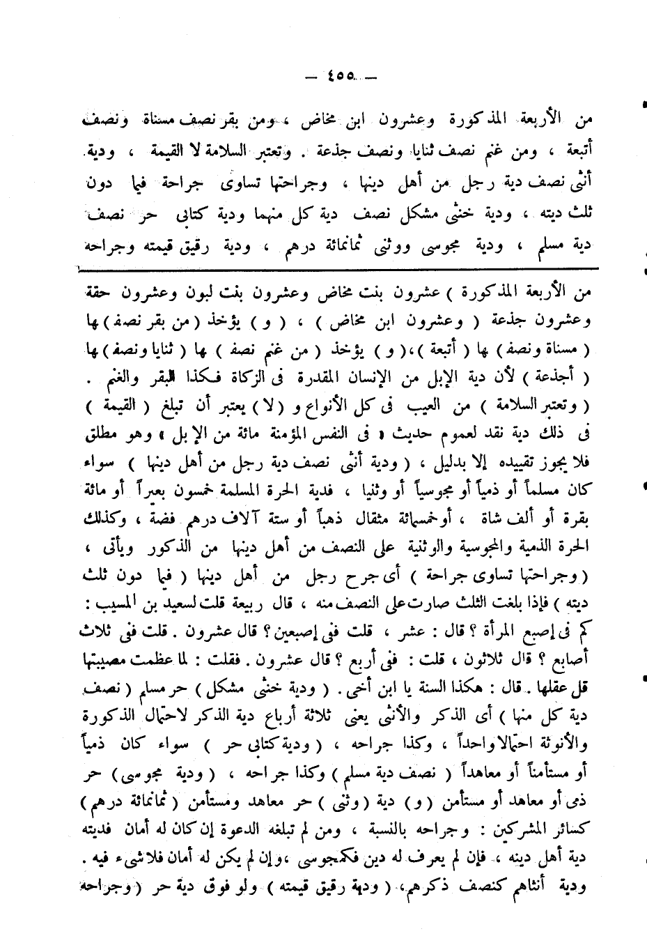 من الأربعة المذكورة وعشرون ابن مخاض، ومن بقر نصف مسناة ونصف أتبعة، ومن غنم نصف ثنايا ونصف جذعة. وتعتبر السلامة لا القيمة. ودية أنثى نصف دية رجل من أهل دينها، وجراحتها تساوي جراحة فيما دون ثلث ديته، ودية خنثى مشكل نصف دية كل منهما ودية كتابي حر نصف دية مسلم، ودية مجوسي ووثنى ثمانمائة درهم، ودية رقيق قيمته وجراحه