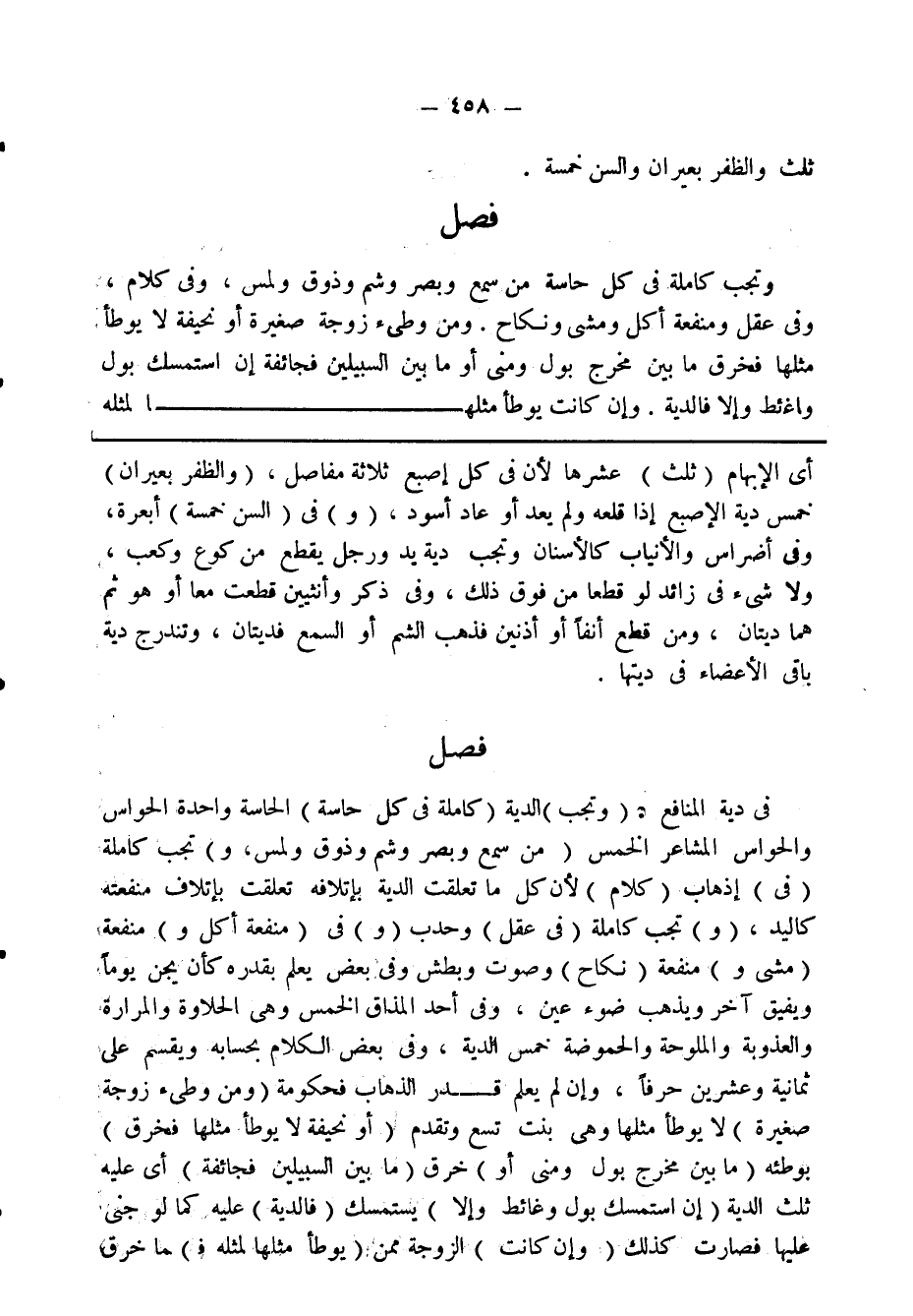 وتجب كاملة في كل حاسة من سمع وبصر وشم وذوق ولمس، وفي كلام، وفي عقل ومنفعة أكل ومشي ونكاح. ومن وطى زوجة صغيرة أو نحيفة لا يوطأ مثلها فخرق ما بين مخرج بول ومني أو ما بين السبيلين فجائفة إن استمسك بول وغائظ وإلا فالدية. وإن كانت يوطأ مثلها لمثله