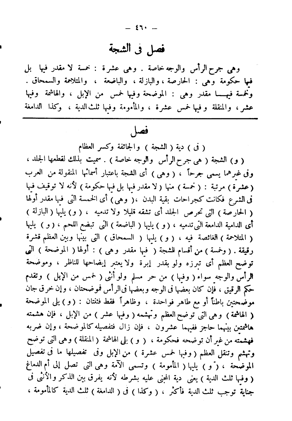 (و) الشجة (هي جرح الرأس والوجه خاصة)، سميت بذلك لقطعها الجلد، وفي غيرهما يسمى جرحا، (وهي) أي الشجة باعتبار أسمائها المنقولة من العرب (عشرة) مرتبة: (خمسة) منها (لا مقدر فيها بل فيها حكومة) لأنه لا توقيف فيها في الشرع فكانت كجراحات بقية البدن، (وهي) أي الخمسة التي فيها مقدر أولها (الحارصة) التي تحرص الجلد أي تشقه قليلا ولا تدميه، (و) يليها (البازلة) أي الدامية الدامعة التي تدميه، (و) يليها (الباضعة) التي تبضع اللحم، (و) يليها (الملاحمة) الغائصة فيه، (و) يليها (السمحاق) التي بينها وبين العظم قشرة رقيقة. (وخمسة) من أقسام الشجة (فيها مقدر وهي): أولها (الموضحة) التي توضح العظم أي تبرزه ولو بقدر إبرة ولا يعتبر إيضاحها للناظر، وموضحة الرأس والوجه سواء (وفيها) من حر مسلم ولو أنثى (خمس من الإبل) وتقدم حكم الرقيق، فإن كان بعضها في الوجه وبعضها في الرأس فموضحتان، وإن خرق جان موضحتين باطنا أو مع طاهر فواحدة، وظاهرا فقط فثنتان، (و) يلي الموضحة (الهاشمة) وهي التي توضح العظم وتهشمه (وفيها عشر) من الإبل، فإن هشمته هاشمتين بينهما حاجز ففيهما عشرون، فإن زال فتفصيله كالموضحة، وإن ضربه فهشمته من غير أن توضحه فحكومة، (و) يلي الهاشمة (المنقلة) وهي التي توضح وتهشم وتنقل العظم (وفيها خمس عشرة) من الإبل وفي تفصيلها ما في تفصيل الموضحة، (و) يليها (المأمومة) وتسمى الآمة وهي التي تصل إلى أم الدماغ (وفيها ثلث الدية) يعني دية المجني عليه بشرطه لأنه يفرق بين الذكر والأنثى في جناية توجب ثلث الدية فأكثر، (وكذا) في (الدامغة) ثلث الدية كالمأمومة،