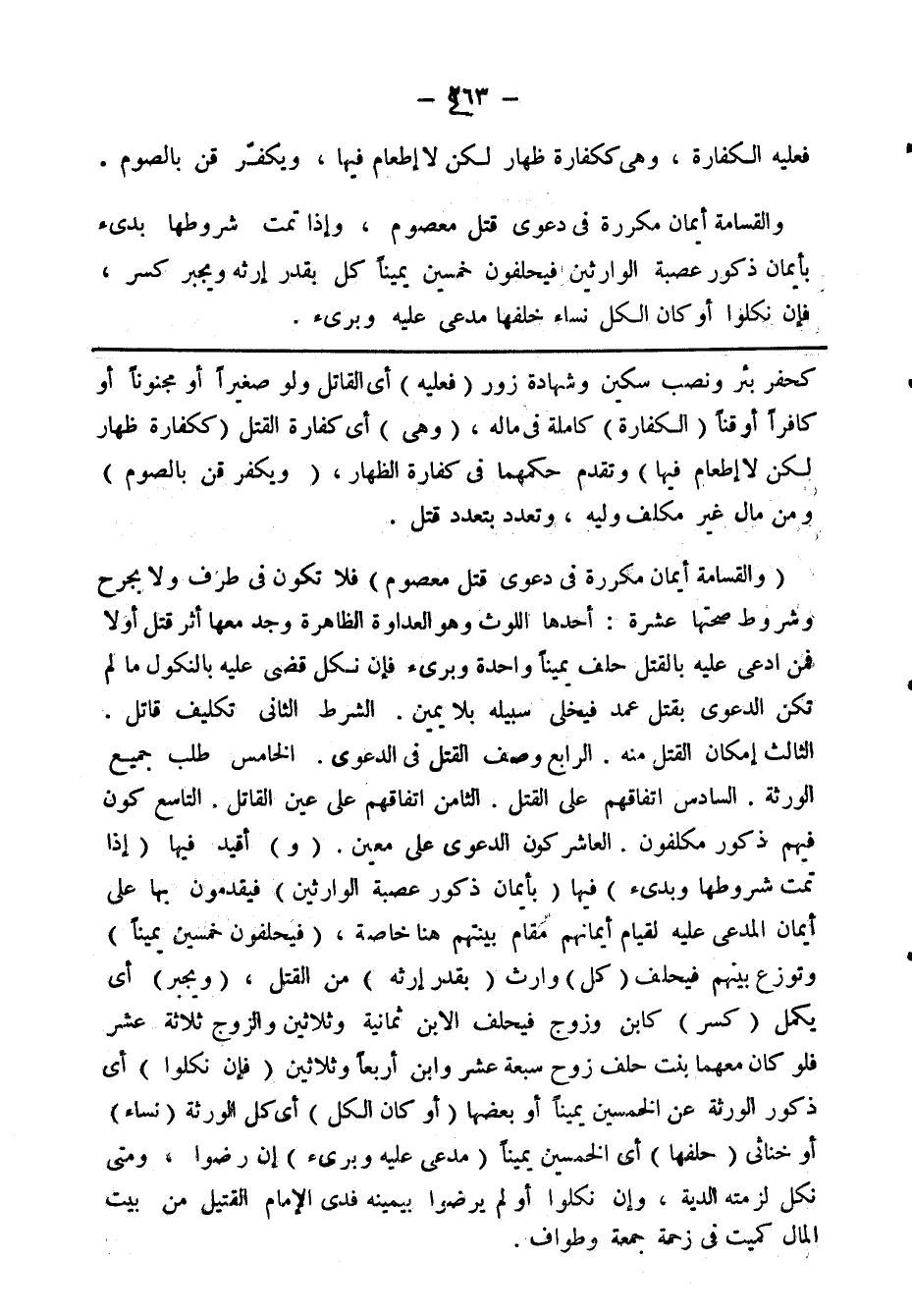 كحفر بئر ونصب سكين وشهادة زور (فعليه) أي القاتل ولو صغيرا أو مجنونا أو كافرا أو قنا (الكفارة) كاملة في ماله، (وهي) أي كفارة القتل (ككفارة ظهار لكن لا إطعام فيها) وتقدم حكمها في كفارة الظهار، (ويكفر قن بالصوم) ومن مال غير مكلف وليه، وتعدد بتعدد قتل (والقسامة أيمان مكررة في دعوى قتل معصوم) فلا تكون في طرف ولا بجرح وشروط صحتها عشرة: أحدها اللوث وهو العداوة الظاهرة وجد معها أثر قتل أو لا فمن ادعى عليه بالقتل حلف يمينا واحدة وبريء فإن نكل قضى عليه بالنكول ما لم تكن الدعوى بقتل عمد فيخلي سبيله بلا يمين. الشرط الثاني تكليف قاتل.