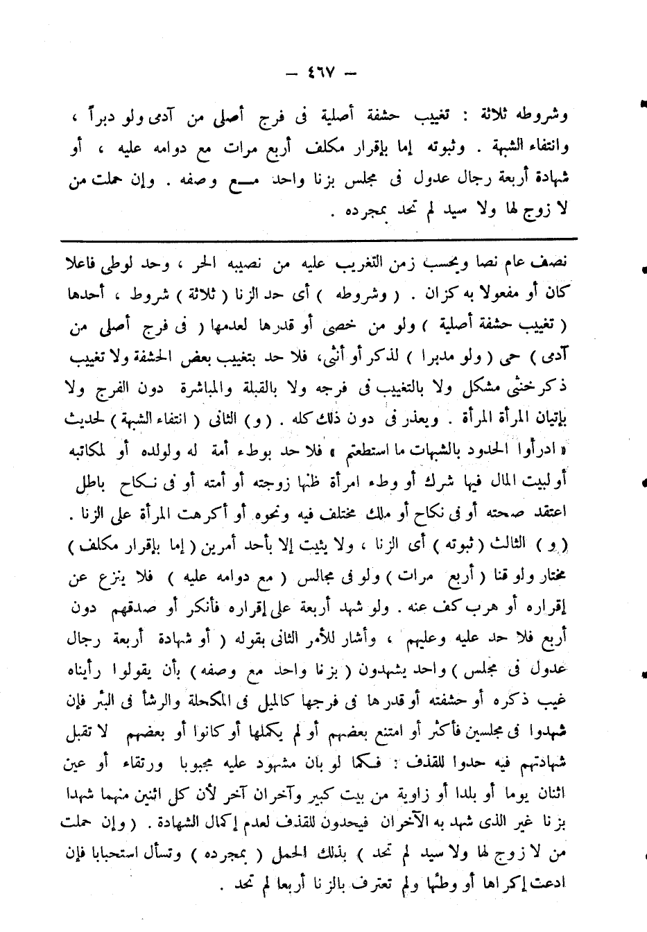 وشروطه ثلاثة: تغييب حشفة أصلية في فرج أصلي من آدمي ولو دبرا، وانتفاء الشبهة، وثبوته إما بإقرار مكلف أربع مرات مع دوامه عليه، أو شهادة أربعة رجال عدول في مجلس بزنا واحد مع وصفه. وإن حملت من لا زوج لها ولا سيد لم تحد بمجرده
