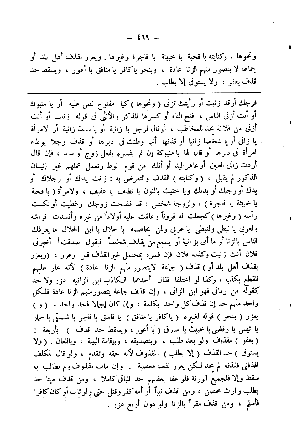 فرجك أو قد زنيت أو رأيتك تزني (ونحوها) كيا مفتوح نص عليه أو يامنيوك أو أنت أزنى الناس، فتح التاء أو كسرها للذكر والأنثى في قوله زنيت أو أنت أزنى من فلانة يحد للمخاطب، أو قال لرجل يا زانية أو يا نسمة زانية أو لامرأة يا زاني أو يا شخصا زانيا أو قذفها أنها وطئت في دبرها أو قذف رجلا بوطء امرأة في دبرها أو قال لها يا منيوكة إن لم يفسره بفعل زوج أو سيد، فإن قال أردت زاني العين أو عاهر اليد أو أنك من قوم لوط وتعمل عملهم غير إتيان الذكور ولم يقبل. (وكنايته) أي القذف والتعريض به: زنت يداك أو رجلاك أو يدك أو رجلك أو بدنك ويا خنيث بالنون يا نظيف يا عفيف، ولامرأة (يا قبيحة يا خبيثة يا فاجرة) ولزوجة شخص: قد فضحت زوجك وغطيت أو نكست رأسه (وغيرها) كجعلت له قرونا وعلقت عليه أولادا من غيره وأفسدت فراشه، ولعربي يانبطي ولنبطي يا عربي ولمن يخاصمه يا حلال يا ابن الحلال ما يعرفك الناس بالزنا أو ما أمي بزانية أو يسمع من يقذف شخصا فيقول صدقت أو أخبرني فلان أنك زنيت وكذبه فلان فإن فسره بمحتمل غير القذف قبل وعزر، (ويعزر بقذف أهل بلد أو) قذف (جماعة لا يتصور منهم الزنا عادة) لأنه لا عار عليهم للقطع بكذبة، وكذا لو اختلفا فقال أحدهما الكاذب ابن الزانية عزر ولا حد كقوله من رماني فهو ابن الزاني، وإن قذف جماعة يتصور منهم الزنا عادة فلكل واحد منهم حد إن قذف كل واحد بكلمة، وإن كان إجمالا فحد واحد، (و) يعزر (بنحو) قوله لغيره (يا كافر يا منافق) يا فاسق يا فاجر يا شقي يا حمار يا تيس يا رفضي يا خبيث يا سارق (يا أعور، ويسقط حد قذف) بأربعة: (بعفو) مقذوف ولو بعد طلب، وبتصديقه، وبإقامة البينة، وباللعان. (ولا يستوفي) حد القذف (إلا بطلب) المقذوف لأنه حقه وتقدم، ولو قال لمكلف اقذفني فقذفه لم يحد لكن يعزر لفعله معصية. وإن مات مقذوف ولم يطالب به سقط وإلا فلجميع الورثة فلو عفا بعضهم حد للباقي كاملا، ومن قذف ميتا حد بطلب وارث محصن، ومن قذف نبيا أو أمه كفر وقتل حتى ولو تاب أو كان كافرا فأسلم، ومن قذف مقرا بالزنا ولو دون أربع عزر