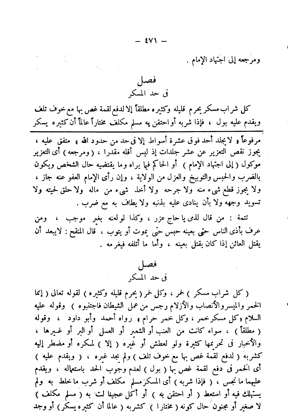 كل شراب مسكر يحرم قليله وكثيره مطلقا إلا لدفع لقمة غص بها مع خوف تلف ويقدم عليه بول, فإذا شربه أو احتقن به مسلم مكلف مختارا عالما أن كثيره يسكر