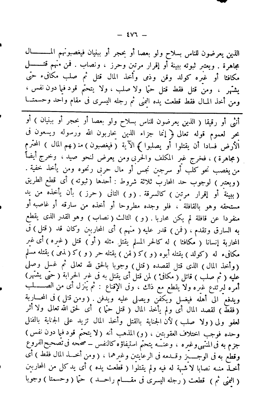 (ويعتبر) لوجوب حد المحارب ثلاثة شروط: أحدهما (ثبوته) أي قطع الطريق (ببينة أو إقرار مرتين) كالسرقة. (و) الثاني (حرز) بأن يأخذه من يد مستحقه وهو بالقافلة, فلو وجده مطروحا أو أخذه من سارقه أو غاصبه أو منفردا عن قافلة لم يكن محاربا. (و) الثالث (نصاب) وهو القدر الذي يقطع به السارق وتقدم, (فمن) قدر عليه (منهم) أي المحاربين وكان قد (قتل) في المحاربة إنسانا (مكافئا) له كالحر المسلم يقتل مثله (أو) قتل (غيره) أي غير مكافئ له (كولد) يقتله أبوه (و) ك (قن) يقتله حر (و) ك (ذمي) يقتله مسلم (وأخذ المال) الذي قتل لقصده (قتل) وجوبا بالحق لله تعالى ثم غسل وصلى عليه (ثم صلب) قاتل (مكافئ) لمن قتل أي يقتل به في غير الحرابة (حتى يشتهر) أمره ليرتدع غيره ولا يقطع مع ذلك, وفي الإقناع: ثم ينزل أي من الصلب ويدفع إلى أهله فيغسل ويكفن ويصلي عليه ويدفن. (ومن قتل) في المحاربة (فقط) لقصد المال أي ولم يأخذ المال (قتل حتما) أي لحق الله تعالى ولا أثر لعفو ولي (ولا صلب) لأن الجناية بالقتل وأخذ المال تزيد على الجناية بالقتل وحده فوجب اختلاف العقوبتين, (و) المذهب أنه (لا يتحتم قود فيما دون نفس) جزم به في المنتهى وغيره, وعنه يتحتم استيفاؤه كالنفس صححه في تصحيح الفروع وقطع به في الوجيز وقدمه في الرعايتين وغيرهما, ومن أخذ المال فقط) أي أخذ منه نصابا لاشبهة له فيه ولم يقتلوا (قطعت يده) أي يد كل من المحاربين (اليمنى ثم) قطعت (رجله اليسرى في مقام واحد) حتما (وحسمتا) وجوبا