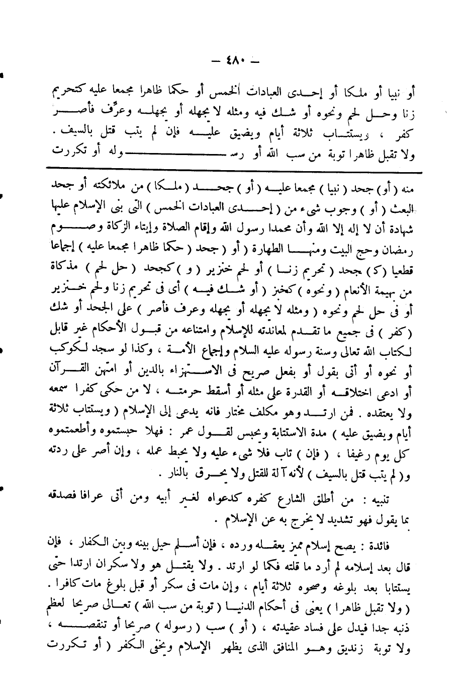 منه (أو) جحد (نبيا) مجمعا عليه (أو) جحد (ملكا) من ملائكته أو حجد البعث (أو) وجوب شيء من (إحدى العبادات الخمس) التي يبنى الإسلام عليها شهادة أن لا إله الله وأن محمدا رسول الله وإقام الصلاة وإيتاء الزكاة وصوم رمضان وحج البيت ومنها الطهارة (أو) جحد (حكما ظاهرا مجمعا عليه) إجماعا قطعيا (ك) جحد (تحريم زنا) أو لحم خنزير (و) كجحد (حل لحم) مذكاة من بهيمة الأنعام (ونحوه) كخبز (أو شك فيه) أي في تحريم زنا ولحم خنزير أو في حل لحم ونحوه (ومثله لايجهله أو يجهله وعرف فأصر) على الجحد أو شك (كفر) في جميع ما تقدم لمعاندته للإسلام وامتناعه من قبول الأحكام غير قابل لكتاب الله وتعالى وسنة رسوله عليه السلام وإجماع الأمة، وكذا لو سجد لكوكب أو نحوه أو أتى بقول أو بفعل صريح في الاستهزاء بالدين أو أمتهن القرآن أو ادعى اختلاقه أو القدرة على مثله أو أسقط حرمته, لا من حكى كفرا سمعه ولا يعتقده, فمن ارتد وهو مكلف مختار فإنه يدعاى إلى الإسلام (ويستتاب ثلاثة أيام ويضيق عليه) مدة الاستتابة ويحبس لقول عمر: فهلا حبستموه وأطعمتوه كل يوم رغيفا, (فإن) تاب فلا شيء عليه ولا يحبط عمله, وإن أصر على ردته و (لم يتب قتل بالسيف) لأنه آلة القتل ولايحرق بالنار