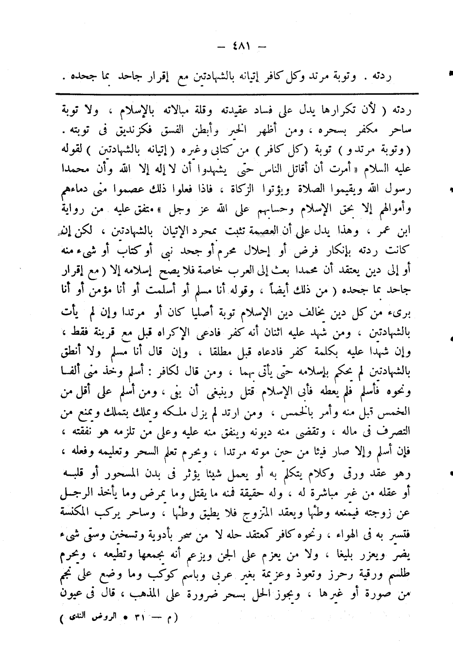 ردته لأن تكرارها يدل على فساد عقيدته وقلة مبالاته بالإسلام، ولا توبة ساحر مكفر بسحره. ومن أظهر الخير وأبطن الفسق فكز نديق في توبته. (وتوبة مرتدو) توبة (كل كافر) من كتابي وغيره (إتيانه بالشهادتين) لقوله عليه السلام «أمرت أن أقاتل الناس حتى يشهدوا أن لا إله إلا الله وأن محمداً رسول الله ويقيموا الصلاة ويؤتوا الزكاة، فإذا فعلوا ذلك عصموا مني دماءهم وأموالهم إلا بحق الإسلام وحسابهم على الله عز وجل» متفق عليه من رواية ابن عمر، وهذا يدل على أن العصمة تثبت بمجرد الإتيان بالشهادتين، لكن إن كانت ردته بإنكار فرض أو إحلال محرم أو جحد نبي أو كتاب أو شيء منه أو إلى دين يعتقد أن محمداً بعث إلى العرب خاصة فلا يصح إسلامه إلا (مع إقرار جاحد بما جحده) من ذلك أيضاً، وقوله أنا مسلم أو أسلمت أو أنا مؤمن أو أنا بريء من كل دين يخالف دين الإسلام توبة أصلياً كان أو مرتداً وإن لم يأت بالشهادتين، ومن شهد عليه اثنان أنه كفر فادعى الإكراه قبل مع قرينه فقط، وإن شهدا عليه بكلمة كفر فادعاه قبل مطلقاً، وإن قال أنا مسلم ولا أنطق بالشهادتين لم يحكم بإسلامه حتى يأتي بها، ومن قال لكافر أسلم وخذ مني ألفاً ونحوه فأسلم فلم يعطيه فأبى الإسلام قتل وينبغي أن يفي، ومن أسلم على أقل من الخمس قبل منه وأمر بالخمس، ومن ارتد لم يزل ملكه ويملك بتملك ويمنع من التصرف في ماله وتقضي منه ديونه وينفق منه عليه وعلى من تلزمه هو نفقته، فإن أسلم وإلا صار فيئا من حين موته مرتداً، ويحرم تعلم السحر وتعليمه وفعله، وهو عقد ورقي وكلام يتكلم به أو يعمل شيئاً يؤثر في بدن المسحور أو قلبه أو عقله من غير مباشر له، وله حقيقة فمنه ما يقتل وما يمرض وما يأخذ الرجل عن زوجته فيمنعه وطئها ويعقد المتزوج فلا يطيق وطئها، وساحر يركب المكنسة فتسير به في الهواء، ونحوه كافر كمعتقد حله لا من سحر بأدوية وتسخين وسقي شيء يضر ويعزر بليغاً، ولا من يعزم على الجن ويزعم أنه يجمعها وتطيعه، ومحرم طلسم ورقية وحرز وتعوذ وعزيمة بغير عربي وباسم كوكب وما وضع على نجم من صورة أو غيرها، ويجوز الحل بسحر ضرورة على المذهب قال في عيون