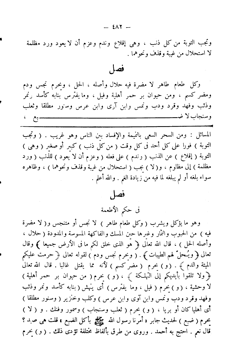 وهو ما يؤكل ويشرب (وكل طعام طاهر) لا نجس أو متنجس و (لا مضرة فيه) من الحبوب والثمار وغيرها حين المسك والفاكهة المسوسة والمدودة (حلال، وأصله الحل)، قال الله تعالى: {هُوَ الَّذِي خَلَقَ لَكُم مَّا فِي الْأَرْضِ جَمِيعًا} وقال تعالى: {أُحِلَّ لَكُمُ الطَّيِّبَاتُ}. (ويحرم نجس ودم) لقوله تعالى: {حُرِّمَتْ عَلَيْكُمُ الْمَيْتَةُ وَالْدَّمُ}. (و) يحرم (مضر كسم) لأنه مما يقتل غالبا قال الله تعالى: {وَلَا تُلْقُوا بِأَيْدِيكُمْ إِلَى التَّهْلُكَةِ}، (و) يحرم (من حيوان بر حمر أهلية) لا وحشية، (و) يحرم (فيل، وما يفترس) أي ينهش (بنابه كأسد ونمر وذئب وفهد وقرد ودب ونمس وابن آوى وابن عرس) وكلب وخنزير (وسنور مطلقا) أي أهليا كان أو بريا، (و) يحرم (ثعلب وسنجاب) وسمر وفنك، و (لا) يحرم (ضبع) لحديث جابر «أمرنا رسول الله (صلى الله عليه وسلم) بأكل الضبع» قلت هي صيد؟ قال نعم. احتج به أحمد. وروى من طرق بألفاظ مختلفة تؤدي ذلك. (و) يحرم