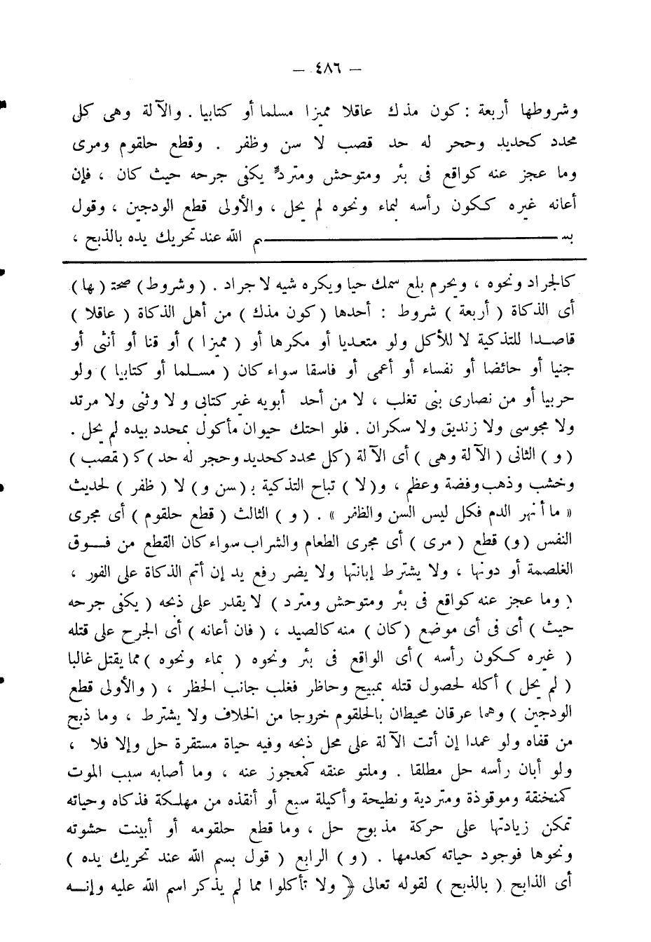 كالجراد ونحوه، ويحرم بلع سمك حيا ويكره شيه لا جراد. (وشروط) صحتها أي الذكاة (أربعة) شروط: أحدهما (كون مذك) من أهل الذكاة (عاقلا) قاصداً للتذكية لا للأكل ولو متعديا أو مكرها أو (مميزا) أو قنا أو أنثى أو جنيا أو حائضاً أو نفساء أو أعمى أو فاسقا سواء كان (مسلما أو كتابيا) ولو حربيا أو من نصارى بني تغلب، لا من أحد أبويه غير كتابي ولا وثني ولا مرتد ولا مجوسي ولا زنديق ولا سكران، فلو احتك حيوان ما كول بمحدد بيده لم يحل. (و) الثاني (الآلة وهي) أي الدلالة (كل محدد كحديد وحجر له حد) كـ (قصب) وخشب وذهب وفضة وعظم، و (لا) تباح التذكية؛ (سن و) لا (ظفر) لحديث. «ما أنهر الدم فكل ليس السن والظفر». (و) الثالث (قطع حلقوم) أي مجرى النفس (و) قطع (مري) أي مجرى الطعام والشراب سواء كان القطع من فوق الغاصمة أو دونها، ولا يشترط إبانتها ولا يضر رفع يد إن أتم الذكاة على الفور، (وما عجز منه كواقع في بئر ومتوحش ومترد) لا يقدر على ذبحه (يكفي جرحه حيث) أي في أي موضع (كان) منه كالصيد، (فإن أعانه) أي الجرح على قتله. (غيره ككون رأسه) أي الواقع في بئر ونحوه (بماء ونحوه) مما يقتل غالبا (لم يحل) أكله لحصول قتله بمبيح وحاظر فغلب جانب الحظر، (والأولى قطع الودجين) وهما عرقان محيطان بالحلقوم خروجا من الخلاف ولا يشترط، وما ذبح من قفاه ولو عمدا إن أنت الآلة على محل ذبحه وفيه حياة مستقرة حل وإلا فلا، ولو أبان رأسه حل مطلقا، وملتو عنقه كمعجوز عنه، وما أصابه سبب الموت كمنخنفة وموقوذة ومتردية ونطيحة وأكيلة سبع أو أنقذه من مهلكة فذكاه وحياته تمكن زيادتها على حركة مذبوح حل، وما قطع حلقومه أو أبينت حشوته ونحوها فوجود حياته كعدمها. (و) الرابع (قول بسم الله عند تحريك يده) أي الذابح (بالذبح) لقوله تعالى: {وَلاَ تَأْكُلُوا مِمَّا لَمْ يُذْكَرِ اسْمُ اللهِ عَلَيْهِ وَإِنَّه