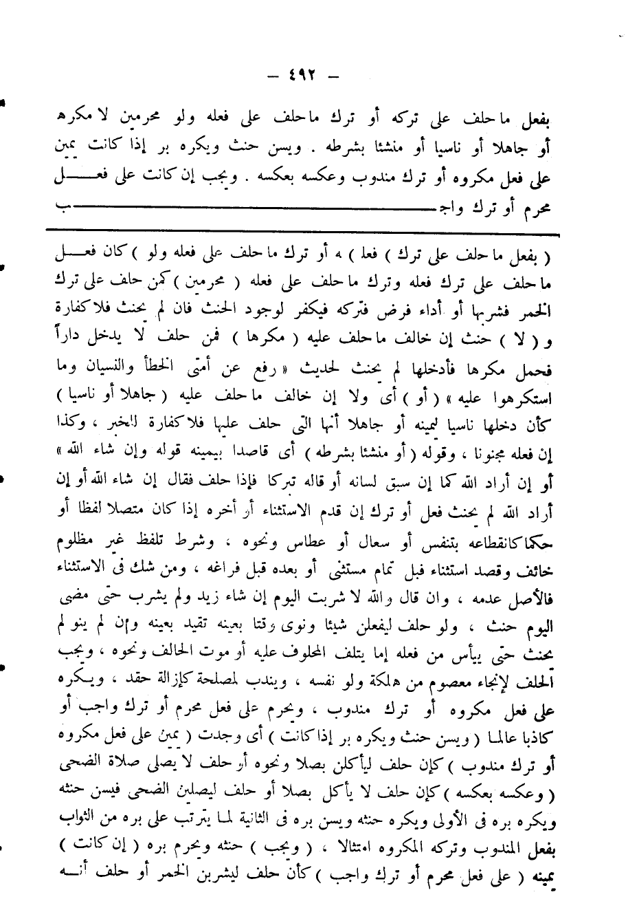 (بفعل ما حلف على ترك) فعله (أو ترك ما حلف على فعله ولو) كان فعل ما حلف على ترك فعله وترك ما حلف على فعله (محرمين) كمن خلف على ترك الخمر فشربها أو أداء فرض فتركه فيكفر لوجود الحنث فإن لم يحنث فلا كفارة و (لا) حنث إن خالف ما حلف عليه (مكرها) فمن حلف لا يدخل دارا فحمل مكرها فأدخلها لم يحنث لحديث «رفع عن أمتي الخطأ والنسيان وما استكرهوا عليه» (أو) أي ولا إن خالف ما حلف عليه (جاهلا أو ناسياً) كأن دخلها ناسيا ليمينه أو جاهلا أنها التي حلف عليها فلا كفارة للخير، وكذا إن فعله مجنونا، وقوله (أو منشئا بشرطه) أي قاصدا بيمينه قوله «إن شاء الله» أو إن أراد الله كما إن سبق لسانه أو قاله تبركا فإذا حلف فقال إن شاء الله أو إن أراد الله لم يحنث فعل أو ترك قدم الاستثناء أو أخره إذا كان متصلا لفظا أو حكما كانقطاعه بتنفس أو سعال أو عطاس ونحوه، وشرط تلفظ غير مظلوم خائف وقصد استثناء قبل تمام مستثنى أو بعده قبل فراغه، ومن شك في الاستثناء فالأصل عدمه، وإن قال والله لا شربت اليوم إن شاء زيد ولم يشرب حتى مضى اليوم حنث، ولو حلف ليفعلن شيئا ونوى وقتا بعينه تقيد بعينه وإن لم ينو لم يحنث حتى ييأس من فعله إما بتلف المحلوف عليه أو موت الحالف ونحوه، ويجب الحلف لإنجاء معصوم من هلكة ولو نفسه، ويندب لمصلحة كإزالة حقد، ويكره عمل مكروه أو ترك مندوب، ويحرم على فعل محرم أو ترك واجب أو كاذبا عالما (ويسن حنث ويكره بر إذا كانت) أي وجدت (يمين على فعل مكروه أو ترك مندوب) كإن حلف ليأكلن بصلا ونحوه أو حلف لا يصلي صلاة الضحى (وعكسه بعكسه) كإن حلف لا يأكل بصلا أو حلف ليصلين الضحى فيسن حنثه ويكره بره في الأولى ويكره حنثه ويسن بره في الثانية لما يترتب على بره من الثواب بفعل المندوب وتركه المكروه امتثالا، (ويجب) حنثه ويحرم بره (إن كانت) يمينه (على فعل محرم أو ترك واجب) كأن حلف ليشربن الخمر أو حلف أنه