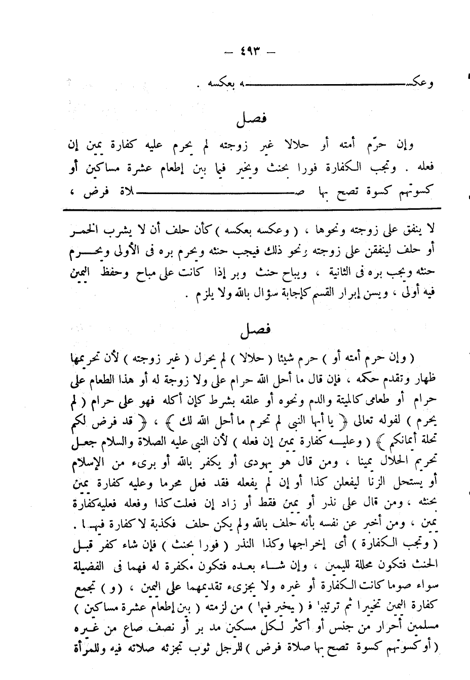 فصل وإن حرم أمته أو حلالا غير زوجته لم يحرم وعليه كفارة يمين إن فعله. وتجب الكفارة فورا بحنث ويخير فيما بين إطعام عشرة مساكين أو كسوتهم كسوة تصح بها صلاة فرض،