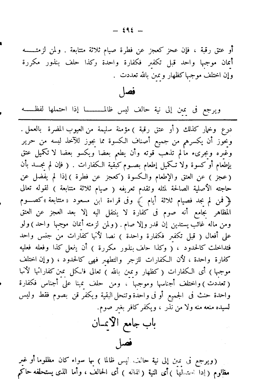 درع وخمار كذلك (أو عتق رقبة) مؤمنة سليمة من العيوب المضرة بالعمل، ويجوز أن يكسوهم من جميع أصناف الكسوة مما يجوز للآخذ لبسه من حرير وغيره يجزي. ما لم تذهب قوته وأن يطعم بعضا ويكسو بعضا لا تكميل عتق بإطعام أو كسوة ولا تكميل إطعام بصوم كبقية الكفارات، (فإن) لم يجد بأن (عجز) عن العتق والإطعام والكسوة (كعجز عن فطرة) إذا لم يفضل عن حاجته الأصلية الصالحة لمثله وتقدم تعريفه (صيام ثلاثة متتابعة) لقوله تعالى: {فَمَن لَّمْ يَجِدْ فَصِيَامُ ثَلاَثَةِ أَيَّامٍ ذلِكَ كَفَّارَةُ} وفي قراءة ابن مسعود «متتابعة» كصوم المظاهر بجامع أنه صوم في كفارة لا ينتقل إليه إلا بعد العجز عن العتق، ومن ماله غائب يستدين إن قدر وإلا صام، (ولمن لزمته أيمان موجبها واحد) ولو على أفعال (قبل تكفير كفارة واحدة) نصا لأنها كفارات من جنس واحد فتداخلت كالحدود، (وكذا حلف بنذور مكررة) أن يفعل كذا وفعله فعليه كفارة واحدة، لأن الكفارات للزجر والتطهير فهي كالحدود، (وإن اختلف موجبها) أي الكفارات (كظهار ويمين الله) تعالى فلكل يمين كفارتها لأنها (تعددت) واختلف أجناسها وموجبها، ومن حلف يمينا على أجناس فكفارة واحدة حنث في الجميع أو في واحدة وتنحل البقية ويكفر قن بصوم فقط وليس لسيده منعه منه ولا من نذر، ويكفر كافر بغير صوم.