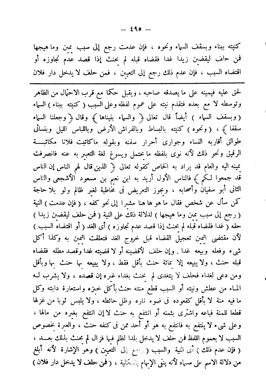 لحق عليه فيمينه على ما يصدقه صاحبه، ويقبل حكما مع قرب الاحتمال من الظاهر وتوسطه لا مع بعده فتقدم نيته على عموم لفظه وعلى السبب (كنيته ببناء) السماء (ويسقف السماء) أيضا قال تعالى: {وَالسَّمَاءَ بَنَيْنَاهَا} وقال {وَجَعَلْنَا السَّمَاءَ سَقْفًا}، (ونحوه) كنيته بالبساط وبالفراش الأرض وباللباس الليل وبنسائي طوالق أقاربه النساء وجواري أحرار سفنه وبقوله ما كاتبت فلانا مكاتبة الرقيق ونحو ذلك لأنه نوى بلفظه ما يحتمل ويسوغ لغة التعبير به عنه فانصرفت يمينه إليه والعام قد يراد به الخاص كقوله تعالى: {الَّذِينَ قَالَ لَهُمُ النَّاسُ إِنَّ النَّاسَ قَدْ جَمَعُوا لَكُمْ} فالناس الأول أريد به ابن نعيم بن مسعود الأشجعي والناس الثاني أبو سفيان وأصحابه، ويجوز التعريض في مخاطبة لغير ظالم ولو بلا حاجة كمن سأل عن شخص فقال ما هو ها هنا مشيرا إلى نحو كفه، (فإن عدمت) النية (رجع إلى سبب يمين وما هيجها) لدلالة ذلك على النية (فمن حلف ليقضين زيدا) حقه (غدا فقضاه قبله لم يحنث إذا قصد عدم تجاوزه) أي الغد (أو اقتضاه السبب) لأن مقتضي اليمين تعجيل القضاء قبل خروج الغد فتعلقت اليمين به وكذا أكل شيء وفعله وبيعه غدا وإن حلف لأقضينه أو لا قضيته غدا وقصد مطله فقضاه قبله حنث، ولا يبيعه إلا بمائة حنث بأقل فقط، ولا يبيعه بها حنث بها وبأقل، ومن دعي لغداء فحلف لا يتغدى لم يحنث بغداء غيره إن قصده، ولا يشرب له الماء من عطش ونيته أو السبب قطع منته حنث بأكل خبزه واستعارة دابته وكل ما فيه منة لا بأقل كقعوده في ضوء ناره وظل حائطه، ولا يلبس ثوبا من غزلها قطعا للمنة فبلعه واشترى بثمنه أو انتفع به حنث لا إن انتفع بغيره من مالها، وعلى شيء لا ينتفع به فانتفع به هو أو أحد ممن في كنفه حنث، والعبرة بخصوص السبب لا بعموم اللفظ فمن حلف لا يدخل بلدا لظلم فيها فزال لم يحنث بذلك بعد، (فإن عدم ذلك) أي النية والسبب (رجع إلى التعيين) وهو الإشارة لأنه أبلغ من دلالة الاسم على مسماه لأنه ينفي الإبهام بالكلية، (فمن حلف لا يدخل دار فلان)