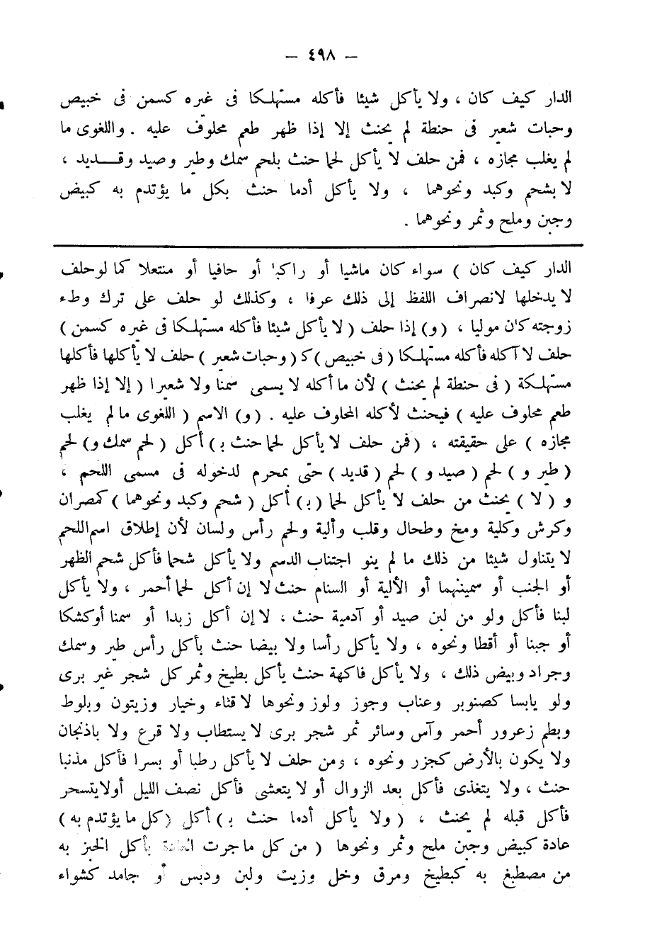 الدار كيف كان، ولا يأكل شيئاً فأكله مستهلكاً في غيره كسمن في خبيص وحبات شعير في حنطة لم يحنث إلا إذا ظهر طعم محلوف عليه. واللغوي ما لم يغلب مجازه، فمن حلف لا يأكل لحماً حنث بلحم سمك وطير وصيد وقديد، لا بشحم وكبد ونحوها، ولا يأكل أدما حنث بكل ما يؤتدم به كبيض وجبن وملح وثمر ونحوهما.