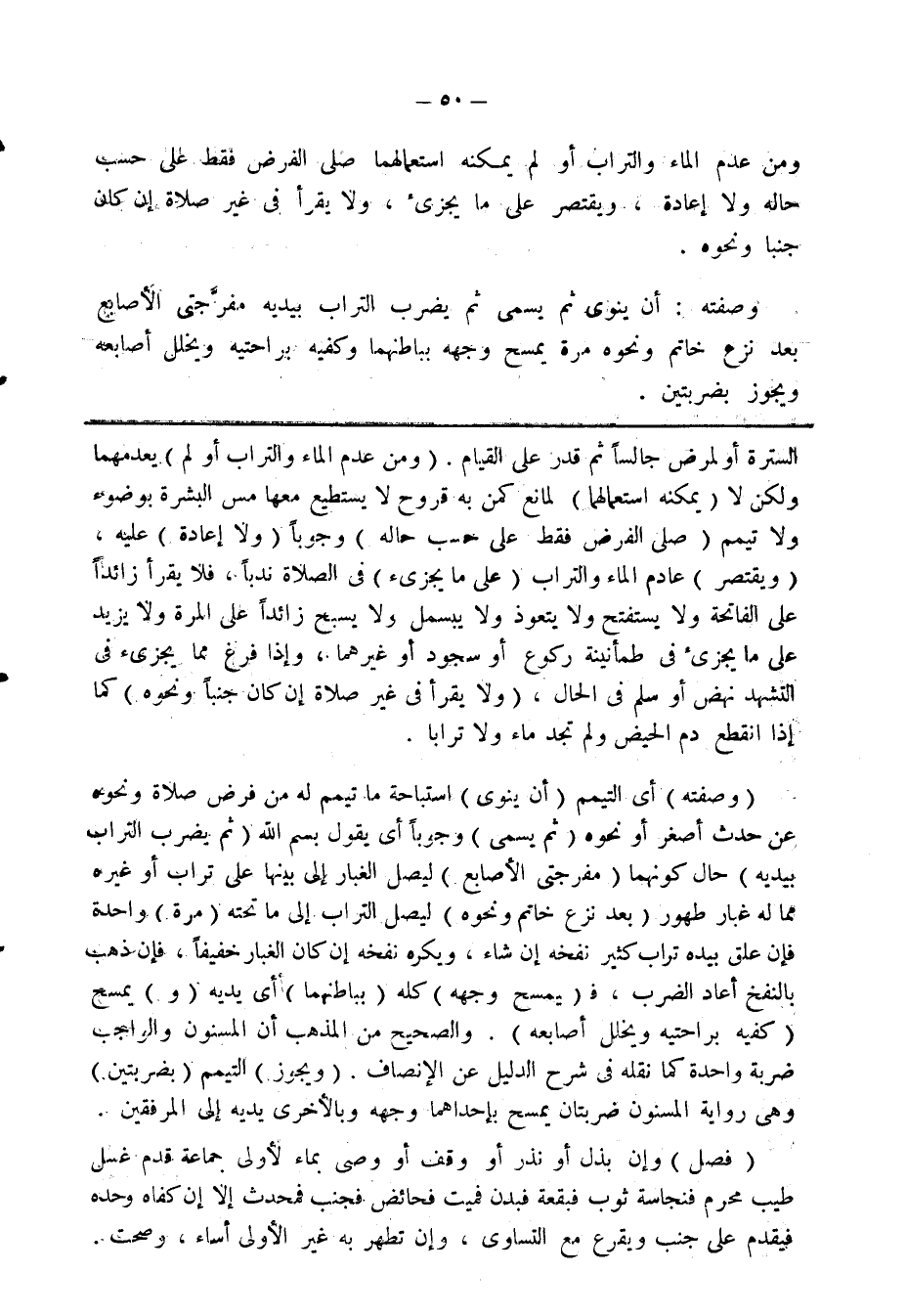 السترة أو لمرض جالسًا ثم قدر على القيام. (ومن عدم الماء والتراب أو لم) يعدمهما ولكن لا (يمكنه استعمالها) لمانع كمن به قروح لا يستطيع معها مس البشرة بوضوء ولا تيمم (صلى الفرض فقط على حسب حاله) وجوبًا (ولا إعادة) عليه، (ويقتصر) عادم الماء والتراب (على ما يجزئ) في الصلاة ندبًا فلا يقرأ زائدًا على الفاتحة ولا يستفتح ولا يتعوذ ولا يبسمل ولا يسبح زائدًا على المرة ولا يزيد على ما يجزئ في طمأنينة ركوع أو سجود أو غيرهما، وإذا فرغ مما يجزئ في التشهد نهض أو سلم في الحال، (ولا يقرأ في غير صلاة إن كان جنبًا ونحوه) كما إذا انقطع دم الحيض ولم تجد ماء ولا ترابًا.
