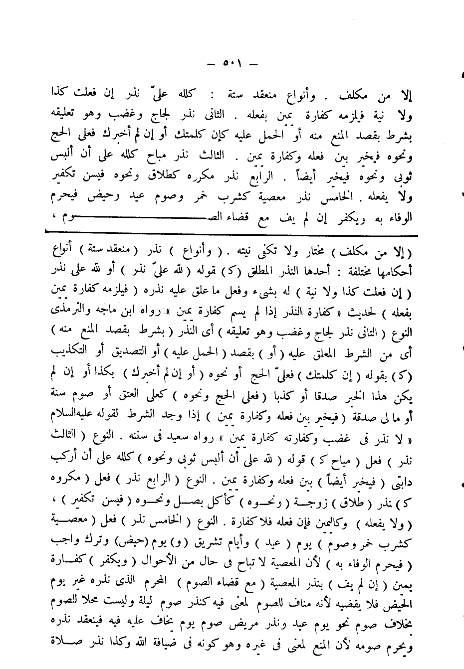 إلا من مكلف. وأنواع منعقد ستة" كلله على نذر إن فعلت كذا ولا نية فيلزمه كفارة يمين بفعله. الثاني نذر لجاج وغضب وهو تعليقه بشرط بقصد المنع منه أو الحمل عليه كإن كلمتك أو إن لم أخبرك فعلى الحج ونحوه فيخير بين فعله وكفارة يمين. الثالث نذر مباح كلله على أن ألبس ثوبي ونحوه فيخير أيضا. الرابع نذر مكروه كطلاق ونحوه فيسن تكفير ولا يفعله. الخامس نذر معصية كشرب خمر وصوم عيد وحيض فيحرم الوفاء به ويكفر إن لم يف مع قضاء الصوم،