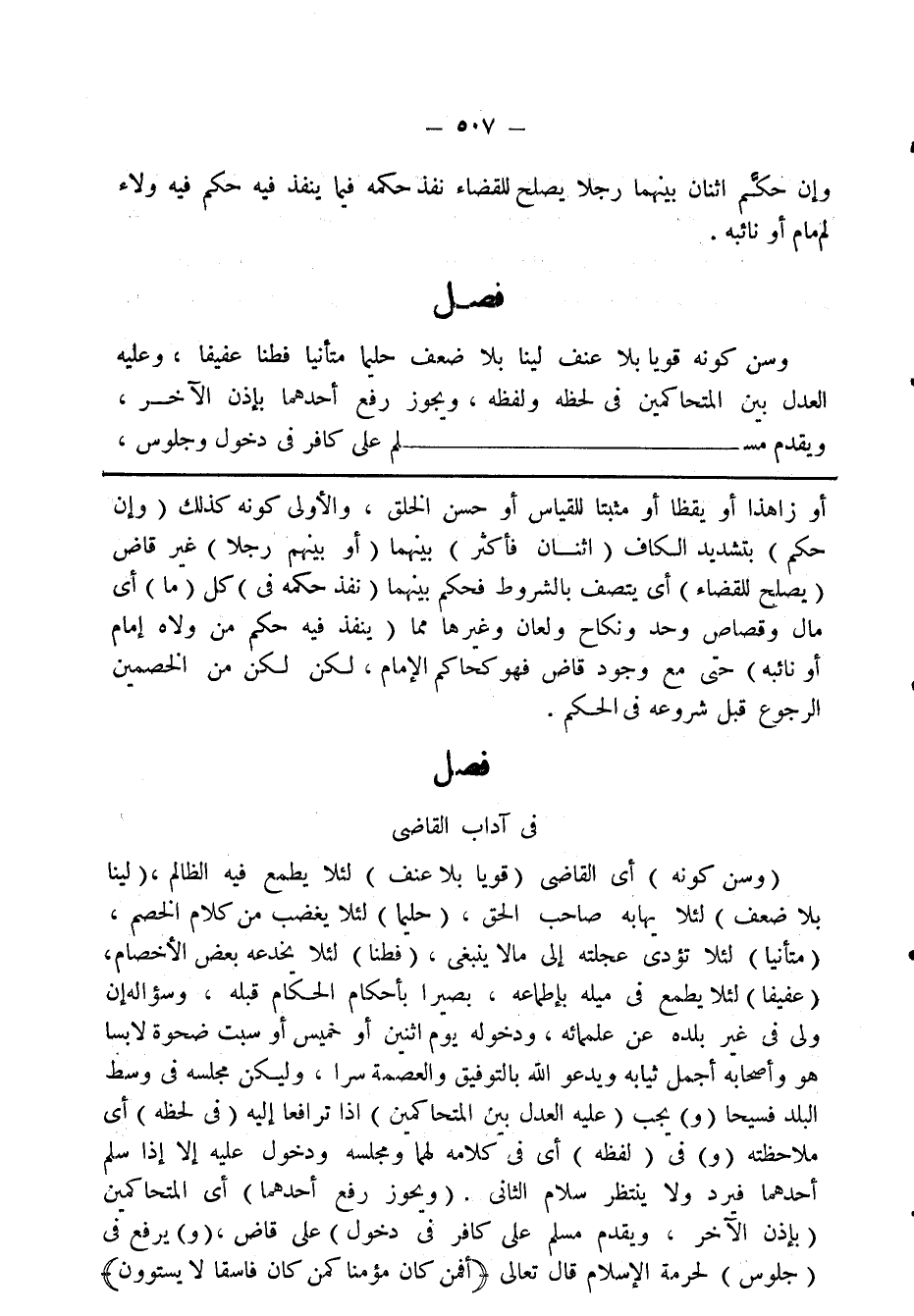 وسن كونه قويا بلا عنف لينا بلا ضعف حليما متأنيا فطنا عفيفا، وعليه العدل بين المتحاكمين فى لحظه ولفظه، ويجوز رفع أحدهما باذن الآخر، ويقدم مسلم على كفار فى دخول وجلوس،