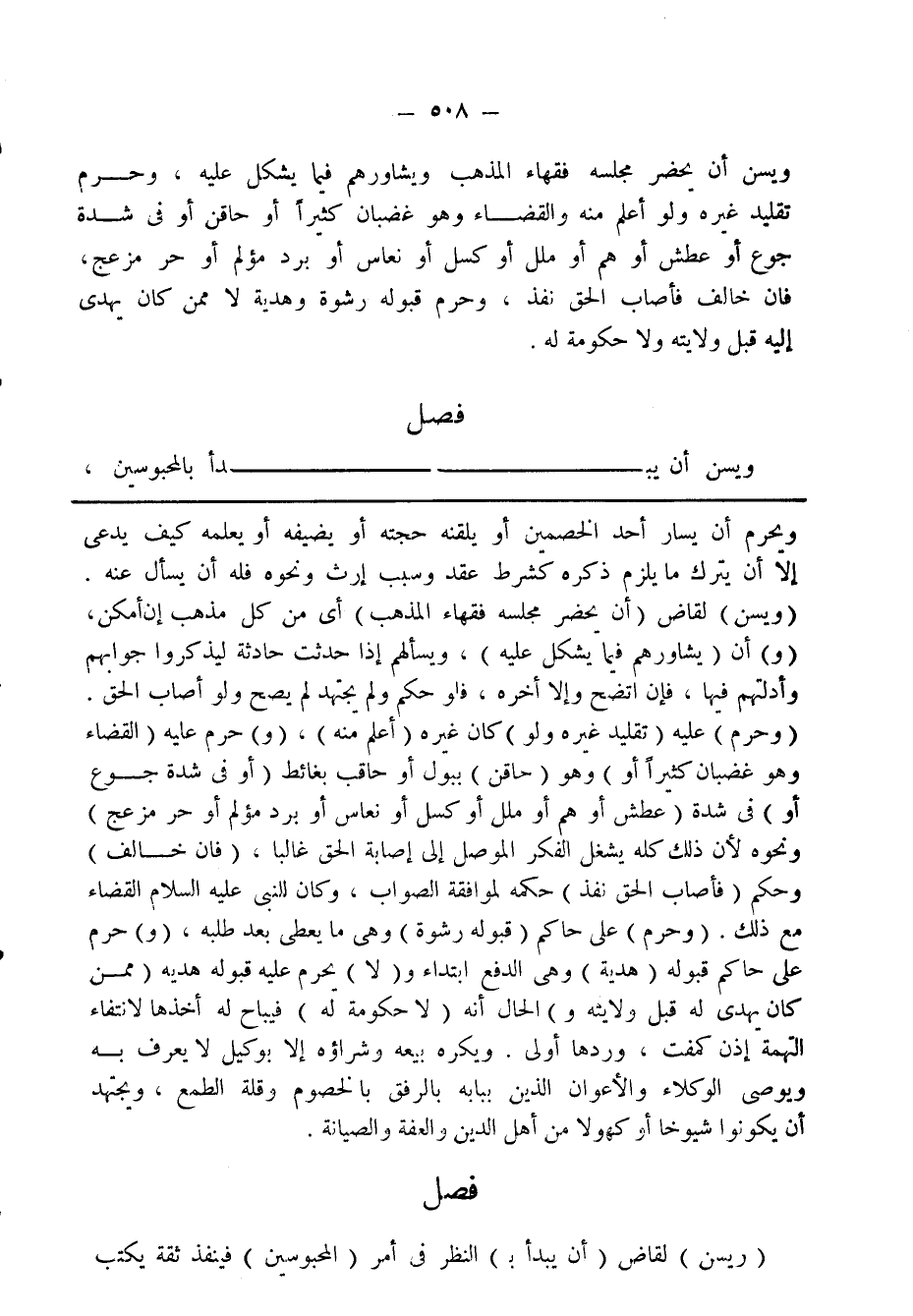 ويحرم أن يسار أحد الخصمين أو يلقنه حجته أو يضيفه أو يعله كيف يدعى، إلا أن يترك ما يلزم ذكره كشرط عقد وسبب إرث فله أن يسأل عنه. (وبسن) لفاض (أن يحضر مجلسه فقهاء المذهب) أى من كل مذهب إن أمكن، (و) أن (يشاورهم فيما يشكل عليه)، ويسألهم إذا حدثت حادثة ليذكروا جوابهم وأدلتهم فيها، فإن اتضح وإلا أخره، فلو حكم ولم يجتهد لم يصح ولو أصاب الحق. (وحرم) عليه (تقليد غيره ولو) كان غيره (أعلم منه)، (و) حرم عليه (القضاء وهو غضبان كثيرا أو) وهو (حاقن) ببول أو حاقب بغائط (أو فى شدة جوع أو) فى شدة (عطش أو هم أو ملل أو كسل أو نعاس أو برد مؤلم أو حر مزعج) ونحو ولأن ذلك كله يشغل الفكر الموصل إلى إصابة الحق غالبا، (فإن خالف) وحكم (فأصاب الحق نفذ) حكمه لموافقة الصواب، وكان للنبي عليه السلام القضاء مع ذلك. (وحرم) على حاكم (قبوله رشوة) وهى ما يعطى بعد طلبه، (و) حرم على حاكم قبوله (هدية) وهى الدفع ابتداء و (لا) يحرم عليه قبوله هدي (ممن كان يهدى له قبل ولايته و) الحال أنه (لا حكومة له) فيباح له أخذها لانتفاء التهمة إذن كمفت، وردها أولى. ويكره بيعه وشراؤه إلا بوكيل لا يعرف به ويوصى الوكلاء والأعوان الذين ببايه بالرفق بالخصوم وقلة الطمع، ويجتهد أن يكونوا شيوخنا أو كهولا من أهل الدين والعفة والصيانة