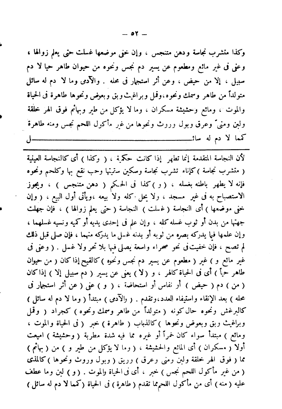 لأن النجاسة المتقدمة إنما تطهر إذا كانت حكمية، (وكذا) أي كالنجاسة العينية (متشرب نجاسة) كإناء تشرب نجاسة وسكين سقيتها وحب نقع بها وكلحم ونحوه فإنه لا يطهر باطنه بغسله، (و) كذا في الحكم (دهن متنجس)، ويجوز الاستصباح في غير مسجد، ولا يحل أكله ولا بيعه ويأتي أول البيع، (وإن خفي موضعها) أي النجاسة (غسلت) النجاسة (حتى يعلم زوالها)، فإن جهلت جهتها من بدن أو ثوب غسله كله، وإن علم في إحدى يديه أو كميه ونسيه غسلهما، وإن علمها فيما يدركه بصره من ثوبه أو بدنه غسل ما يدركه منهما، فإن صلى قبل ذلك لم تصح، فإن خفيت في نحو صحراء واسعة يصلي فيها بلا تحر ولا غسل. (وعفى في غير مائع و) غير (مطعوم عن يسير دم نجس ونحوه) كالقيح إذا كان (من حيوان طاهر حيًا) أي في الحياة كالهر، و (لا) يعفى عن يسير (دم سبيل إلا) إذا كان (من) دم (حيض) أو نفاس أو استحاضة، (و) عفى (عن أثر استجمار في محله) بعد الإنقاء واستيفاء العدد وتقدم. (والآدمي) مبتدأ (وما لا دم له سائل) كالبرغش ونحوه حال كونه (متولدًا من طاهر وسمك ونحوه) كجراد (وقمل وبراغيث وبق وبعوض ونحوها) كالذباب (طاهرة) خبر (في الحياة والموت، ومائع) مبتدأ سواء كان خمرًا أو غيه مما فيه شدة مطربة (وحشيشة) أميعت أو لا (مسكران) أي المائع والحشيشة، (وما لا يؤكل من طير و) من (بهائم) مما (فوق الهر خلقة ولبن ومني وعرق) وريق (وبول وروث ونحوهها) كالمذي (من غير مأكول اللحم نجس) خبر، أي في الحياة والموت. (و) لبن وما عطف عليه (منه) أي من مأكول اللحم مما تقدم (طاهرة) في الحياة (كمما لا دم له سائل)