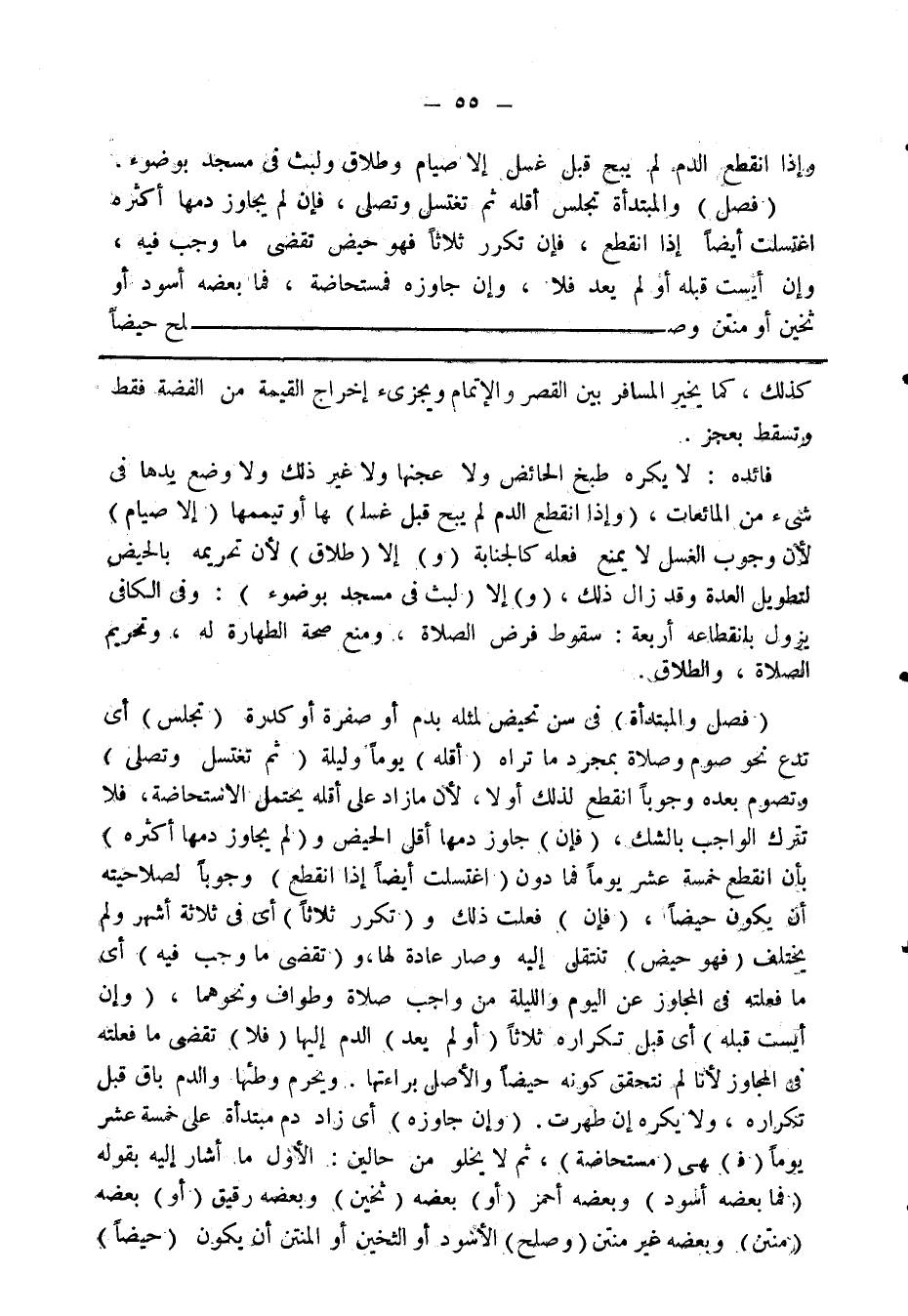 فائدة: لا يكره طبخ الحائض، ولا عجنها ولا غير ذلك، ولا وضع يدها في شيء من المائعات، (وإذا انقطع الدم لم يبح قبل غسلـ) ها أو تيممها (إلا صيام) لأن وجوب الغسل لا يمنع فعله كالجنابة (و) إلا (طلاق) لأن تحريمه بالحيض لتطويل العدة وقد زال ذلك، (و) إلا (لبث في مسجد بوضوء)، وفي الكافي يزول بانقطاعه أربعة: سقوط فرض الصلاة، ومنع صحة الطهارة له، وتحريم الصلاة، والطلاق.