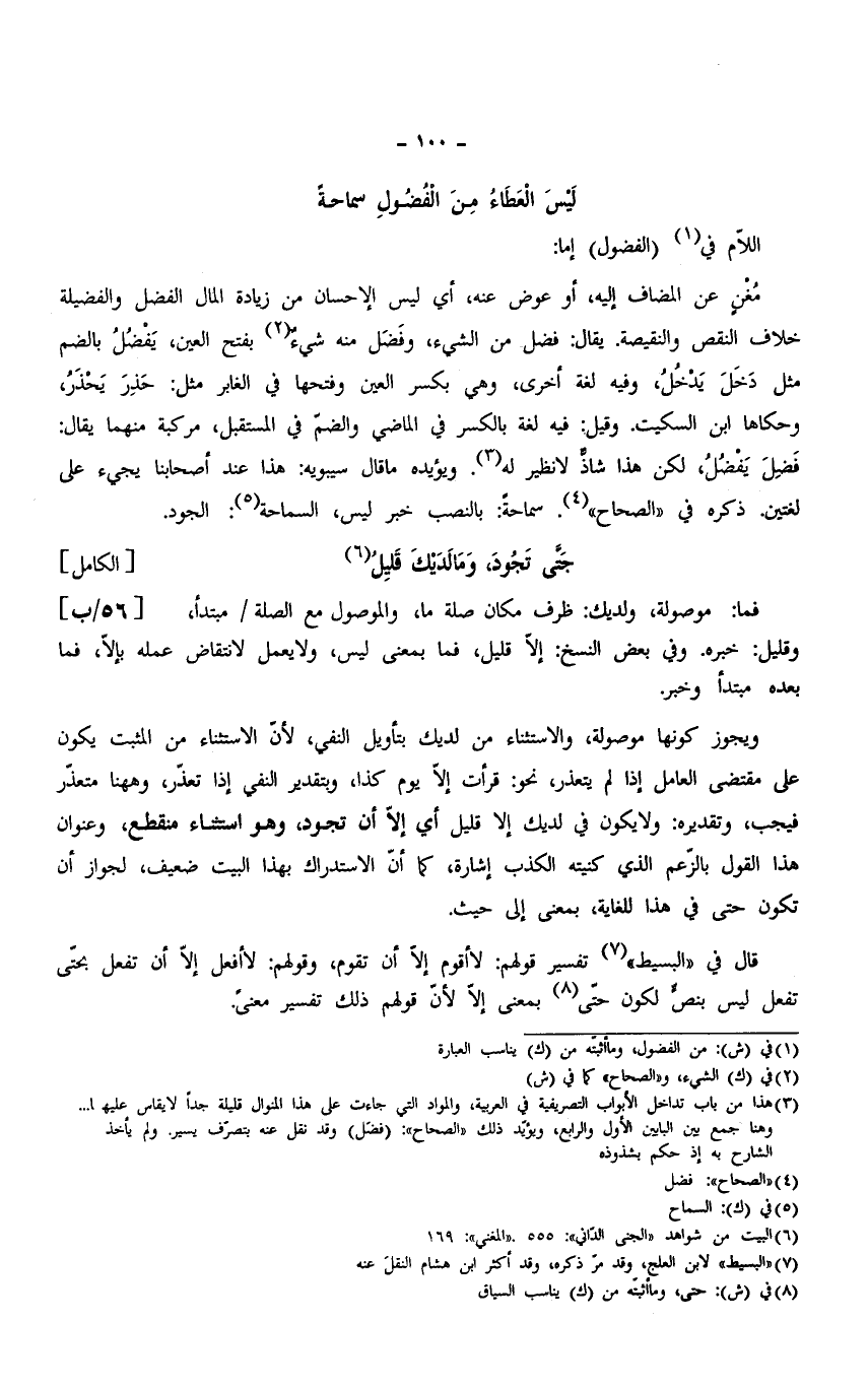 ويجوز كونها موصولة، والاستثناء من لديك بتأويل النفي، لأن الاستثناء من المثبت يكون على مقتضى العامل إذا لم يتعذر، نحو: قرأت إلَّا يوم كذا، وبتقدير النفي إذا تعذر، وهاهنا متعذر فيجب، وتقديره: ولا يكون في لديك إلا قليل أي إلَّا أن تجود، وهو استثناء منقطع، وعنوان هذا القول بالزعم الذي كنيته الكذب إشارة، كما أن الاستدراك بهذا البيت ضعيف، لجواز أن تكون حتى في هذا للغاية، بمعنى إلى حيث.