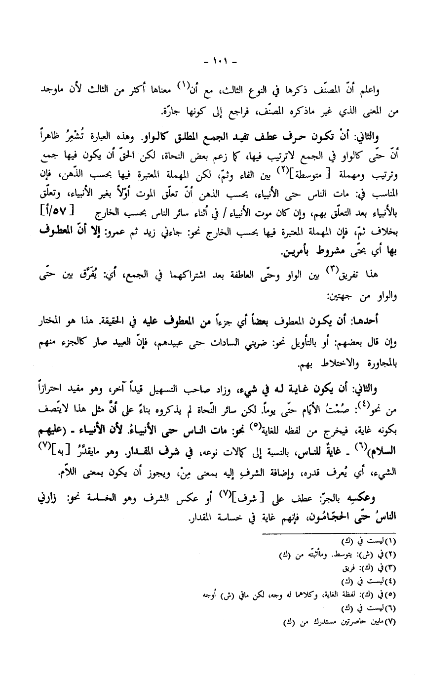 والثاني: أن تكون حرف عطف تفيد الجمع المطلق كالواو. وهذه العبارة تُشعِرُ ظاهرًا أنَّ حتى كالواو في الجمع لا ترتيب فيها، كما زعم بعض النحاة، لكن الحق أن يكون فيها جمع وترتيب ومهملة [متوسطة] بين الفاء وثمّ، لكن المهملة المعتبرة فيها بحسب الذهن، فإن المناسب في: مات الناس حتى الأنبياء، بحسب الذهن أن تعلق الموت أولًا بغير الأنبياء، وتعلق بالأنبياء بعد التعلق بهم، وإن كان موت الأنبياء في أثناء سائر الناس بحسب الخارج بخلاف ثم، فإن المهملة المعتبرة فيها بحسب الخارج نحو جاءني زيد ثم عمرو: إلا أن المعطوف بها أي بحتى مشروط بأمرين.