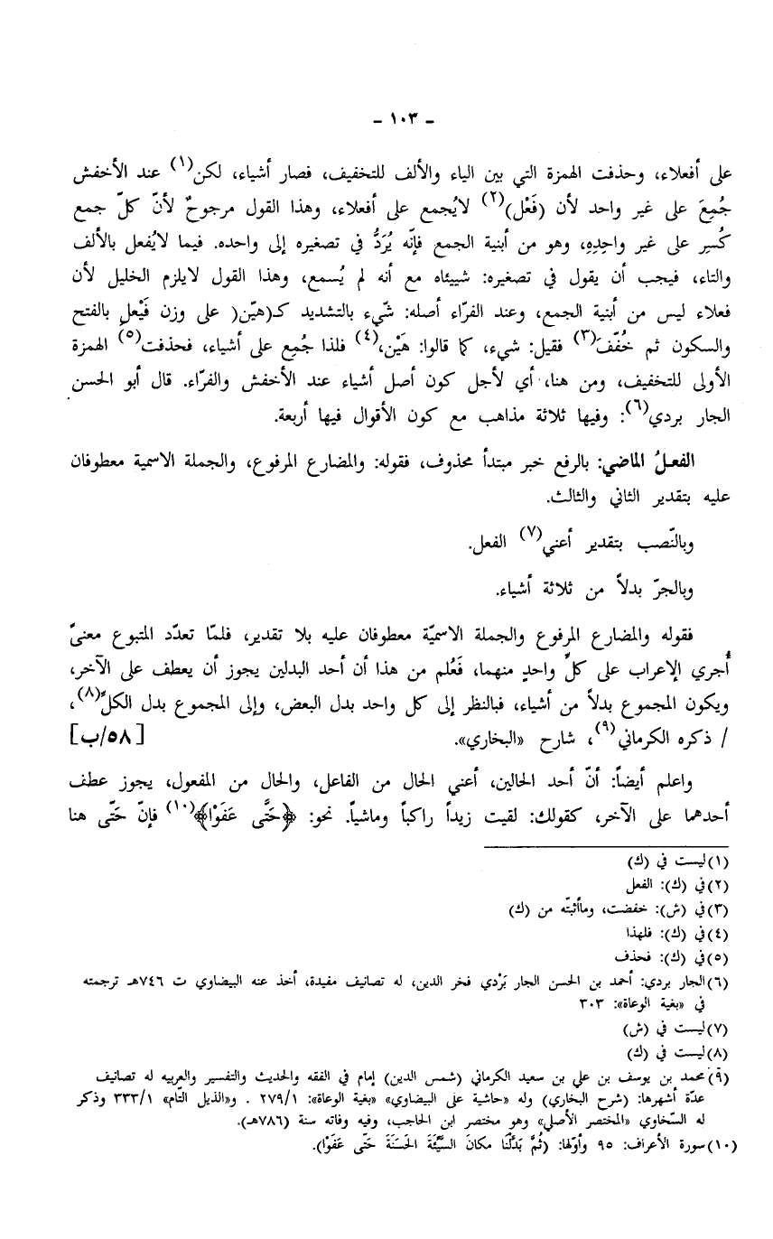 على أفعلاء، وحذفت الهمزة التي بين الياء والألف للتخفيف، فصار أشياء، لكن عند الأخفش جُمِعَ على غير واحد لأن (فَعْل) لا يُجمع على أفعلاء، وهذا القول مرجوحٌ لأن كل جمع كُسر على غير واحِدِهِ، وهو من أبنية الجمع فإنه يُرَد في تصغيره إلى واحده. فيما لا يُفعل بالألف والتاء، فيجب أن يقول في تصغيره: شييئاه مع أنه لم يُسمع، وهذا القول لا يلزم الخليل لأن فعلاء ليس من أبنية الجمع، وعند الفراء أصله: شيء بالتشديد كـ (هين) على وزن فَيْعل بالفتح والسكون ثم خُفّفَ فقيل: شيء، كما قالوا: هَيْن، فلذا جُمِع على أشياء، فحذفت الهمزة الأولى للتخفيف، ومن هنا, أي لأجل كون أصل أشياء عند الأخفش والفراء. قال أبو الحسن الجار بردي: وفيها ثلاثة مذاهب مع كون الأقوال فيها أربعة.