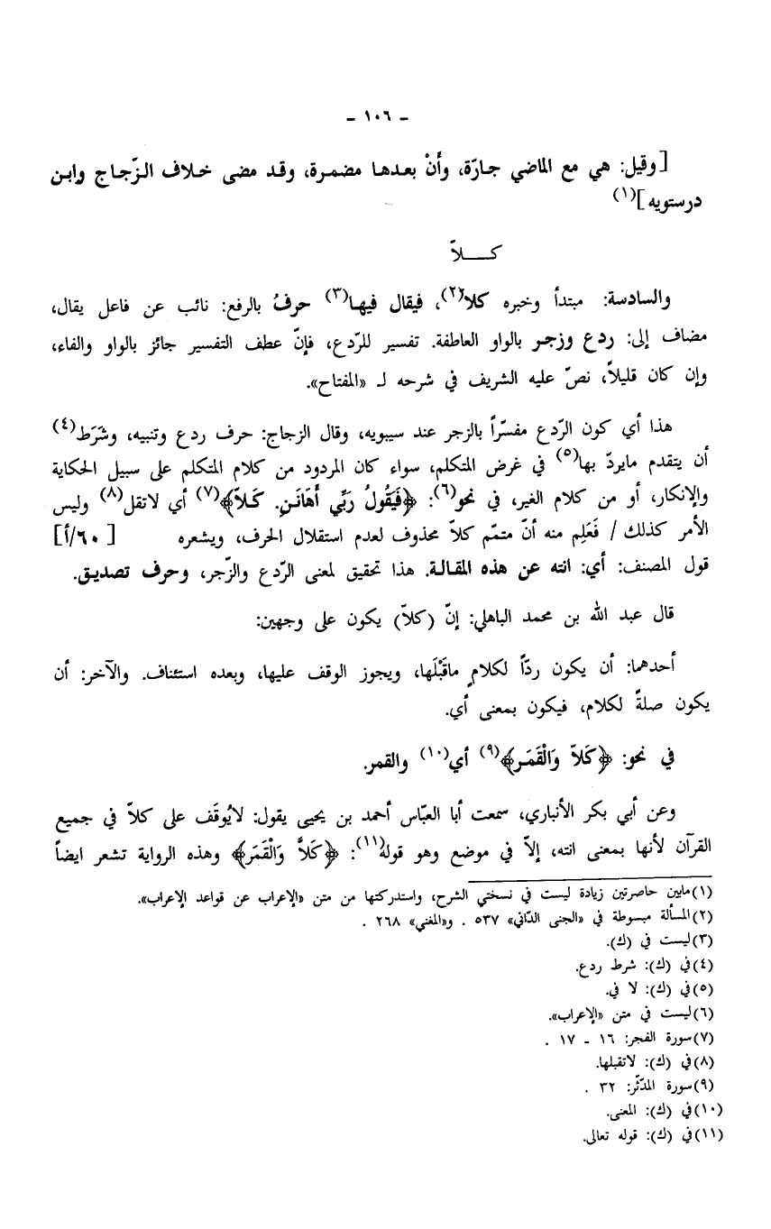 والسادسة: مبتدأ وخبره كلا، فيقال فيها حرفُ بالرفع: نائب عن فاعل يقال، مضاف إلى: ردع وزجر بالواو العاطفة. تفسير للردع، فإن على التفسير جائز بالواو والفاء، وإن كان قليلًا، نصّ عليه الشريف في شرحه لـ"المفتاح".