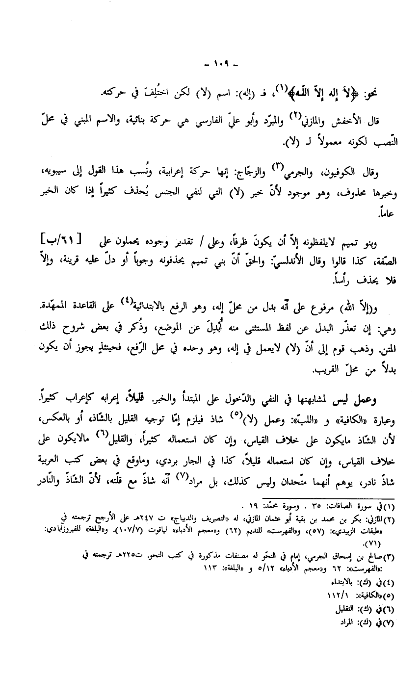 وعمل ليس لمشابهتها في النفي والدخول على المبتدأ والخبر. قليلًا، إعرابه كإعراب كثيرًا. وعبارة "الكافية" و"اللب": وعمل (لا) شاذ فيلزم إمّا توجيه القليل بالشاذ، أو بالعكس، لأن الشاذ ما يكون على خلاف القياس، وان كان استعماله كثيرًا، والقليل ما لا يكون على خلاف القياس، وإن كان استعماله قليلًا، كذا في الجار بردي، وما وقع في بعض كتب العربية شاذ نادر، يوهم أنهما متحدان وليس كذلك، بل مراد أنه شاذ مع قلته، لأن الشاذ والنادر