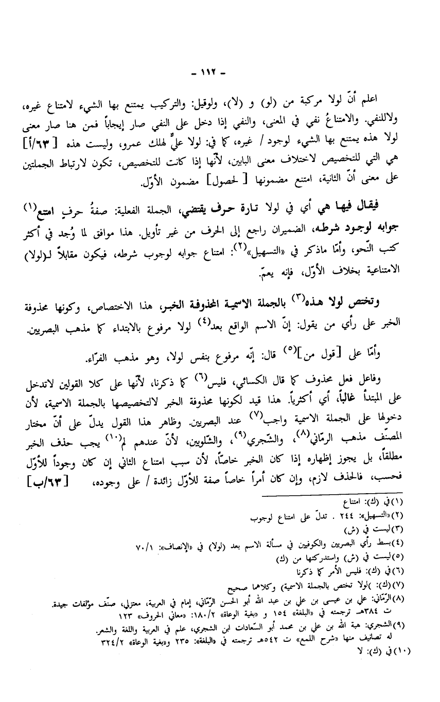 اعلم أن لولا مركبة من (لو) و (لا)، ولو قيل: والتركيب يمتنع بها الشيء لامتناع غيره، ولا للنفي الامتناعُ نفي في المعنى، والنفي إذا دخل على النفي صار إيجابًا فمن هنا صار معنى لولا هذه يمتنع بها الشيء لوجود غيره، كما في: لولا علي لهلك عمرو، وليست هذه هي التي للتخصيص لاختلاف معنى البابين، لأنها إذا كانت للتخصيص، تكون لارتباط الجملتين على معنى أن الثانية، امتنع مضمونها [لحصول] مضمون الأوّل.