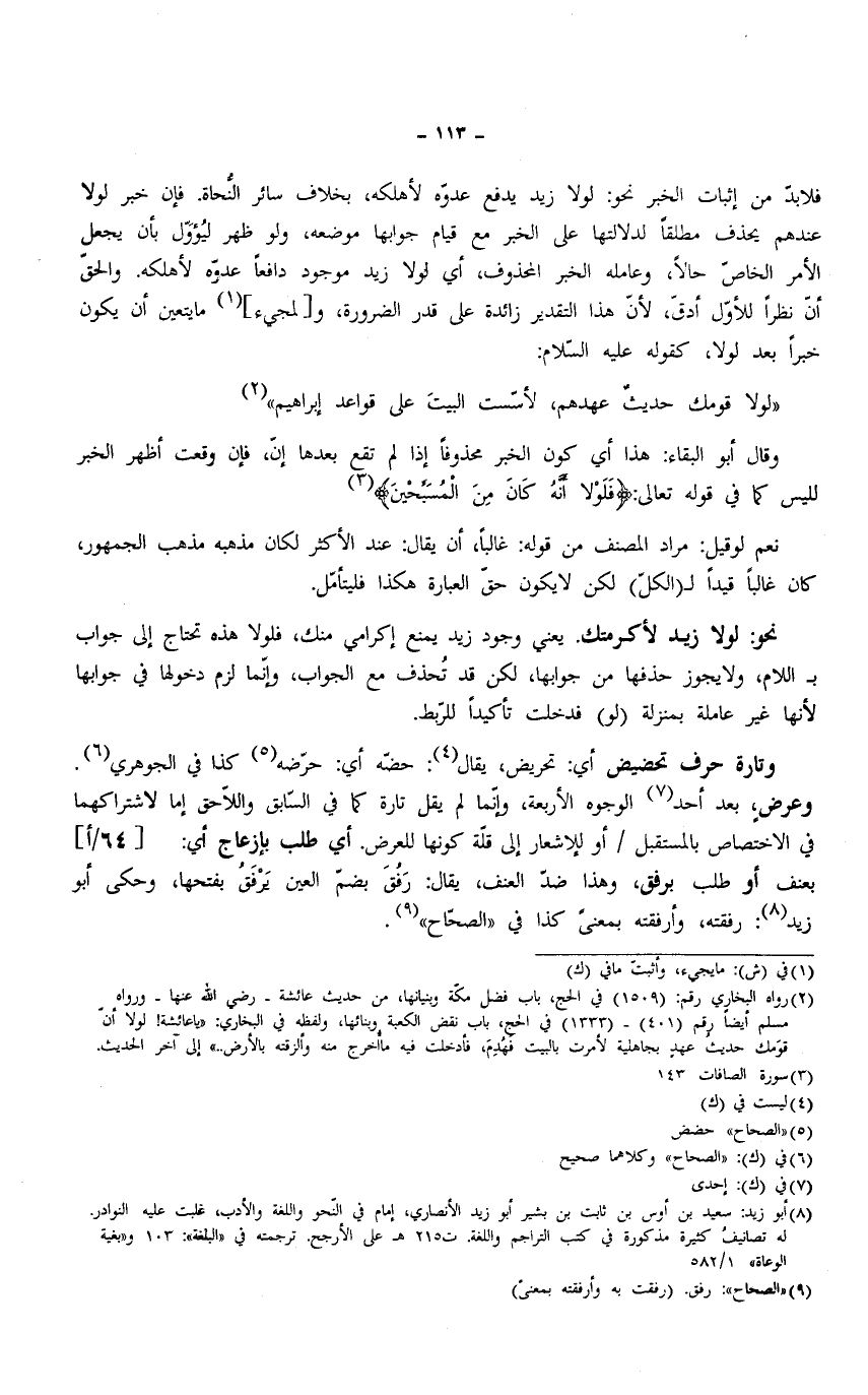 فلابد من إثبات الخبر نحو: لولا زيد يدفع عدوّه لأهلكه، بخلاف سائر النحاة. فإن خبر لولا عندهم يحذف مطلقا لدلالتها على الخبر مع قيام جوابها موضعه، ولو ظهر ليُؤوِّل بأن يجعل الأمر الخاص حالًا, وعامله الخبر المحذوف، أي لولا زيد موجود دافعًا عدوه لأهلكه. والحق أن نظرًا للأول أدق, لأن هذا التقدير زائدة على قدر الضرورة، و [لمجيء] ما يتعين أن يكون خبرًا بعد لولا، كقوله -عليه السلام-: