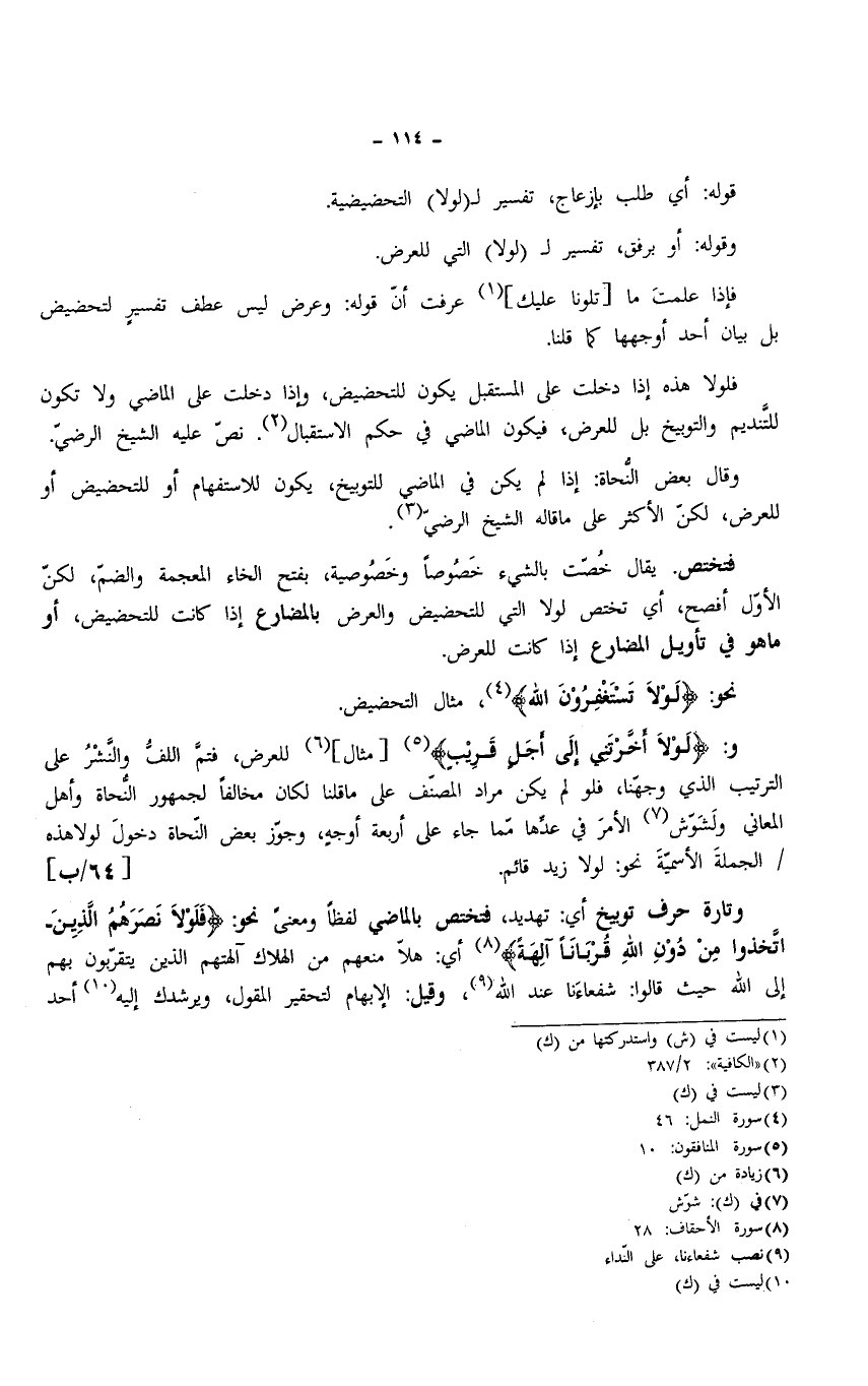 فلولا هذه إذا دخلت على المستقبل يكون للتحضيض, وإذا دخلت على الماضي ولا تكون للتَّنديم والتوبيخ بل للعرض، فيكون الماضي في حكم الاستقبال. نصّ عليه الشيخ الرضي.
