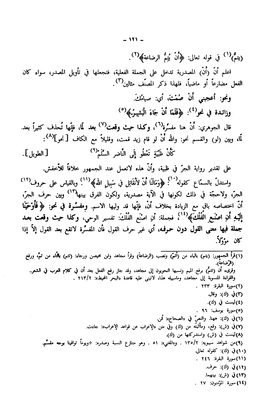 واستدل بالسماع كقوله {وَمَا لَنَا أَلَّا نُقَاتِلَ فِي سَبِيلِ اللَّهِ}. وبالقياس على حروف الجر، ولا حجة في ذلك لكونها في الآية مصدرية، ولكون الفرق بينها وبين حرف الجر، أنّ اختصاصه باقٍ مع الزيادة بخلاف أنْ، فإنها قد وليها الاسم. ومفسرة في نحو: {فَأَوْحَيْنَا إِلَيْهِ أَنِ اصْنَعِ الْفُلْكَ} , فجملة: أنِ اصْنَع الفُلكَ: تفسير الوحي، وكذا حيث وقعت بعد جملة فيها معنى القول دون حرفه، أي غير حرف القول فأن المفسرة لا تقع بعد القول إلَّا إذا كان مؤولا.