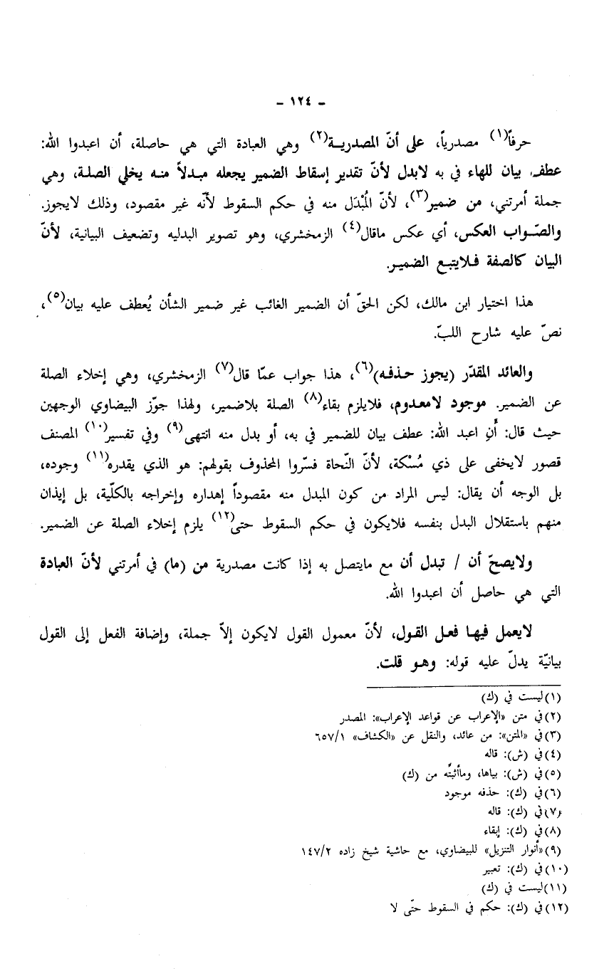 والعائد المقدر (يجوز حذفه)، هذا جواب عما قال الزمخشري، وهي إخلاء الصلة عن الضمير. موجود لا معدوم، فلا يلزم بقاء الصلة بلا ضمير، ولهذا جوّز البيضاوي الوجهين حيث قال: أنِ اعبد الله: عطف بيان للضمير في به، أو بدل منه انتهى وفي تفسير المصنف قصور لا يخفى على ذي مُسْكة، لأنّ النحاة فسّروا المحذوف بقولهم: هو الذي يقدره وجوده، بل الوجه أن يقال: ليس المراد من كون المبدل منه مقصودًا إهداره وإخراجه بالكلية، بل إيذان منهم باستقلال البدل بنفسه فلا يكون في حكم السقوط حتى يلزم إخلاء الصلة عن الضمير.