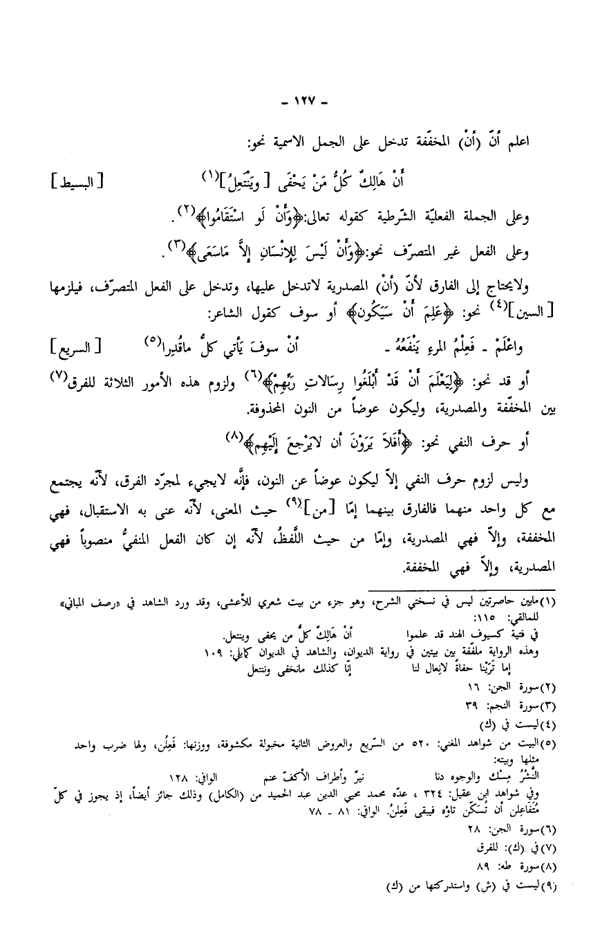 ولا يحتاج إلى الفارق لأنّ (أنْ) المصدرية لا تدخل عليها، وتدخل على الفعل المتصرف، فيلزمها [السين] نحو: {عَلِمَ أَنْ سَيَكُونُ} أو سوف كقول الشاعر: