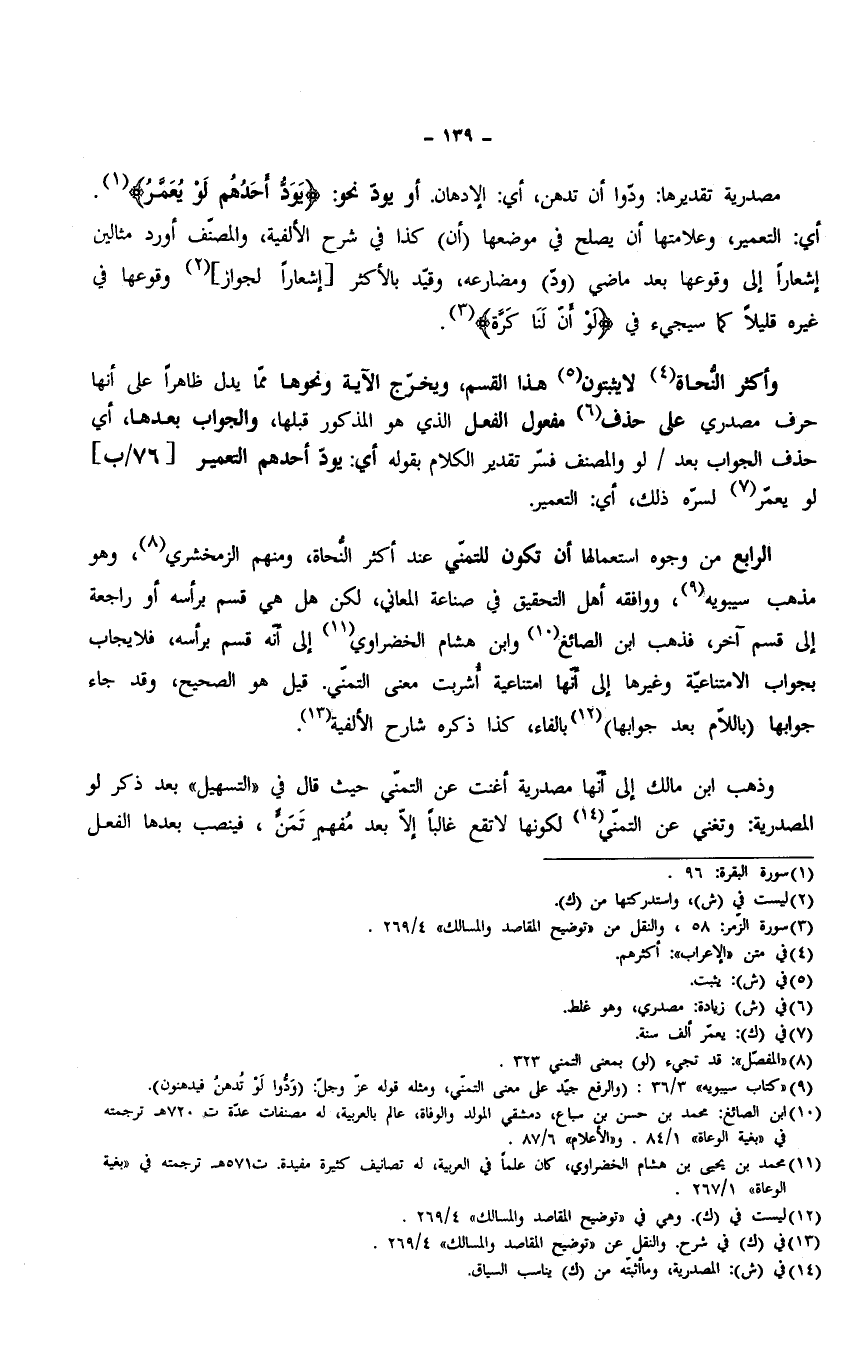 وأكثر النُّحاة لا يثبتون هذا القسم، ويخرّج الآية ونحوها ممَّا يدل ظاهرًا على أنها حرف مصدري على حذف مفعول الفعل الذي هو المذكور قبلها، والجواب بعدها، أي حذف الجواب بعد لو والمصنف فسّر تقدير الكلام بقوله أي: يودّ أحدهم التعمير لو يعمّر لسرّه ذلك، أي: التعمير.