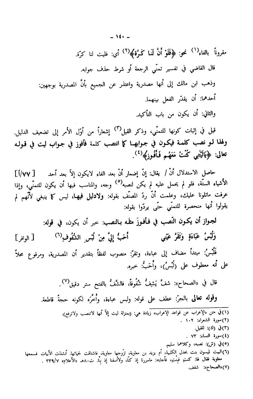 قيل في إثبات كونها للتمنّي، وذكر القيل إشعارًا من أوّل الأمر إلى تضعيف الدليل. ولهذا لو نصب كلمة فيكون في جوابها كما انتصب كلمة فأفوز في جواب ليت في قوله تعالى: {يَالَيْتَنِي كُنْتُ مَعَهُمْ فَأَفُوزَ}.