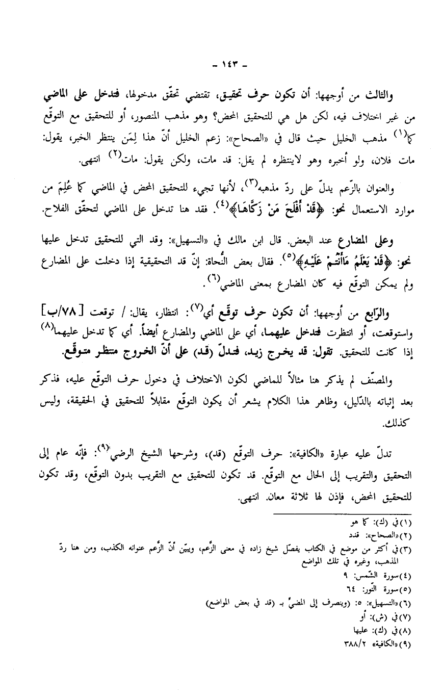 تدل عليه عبارة "الكافية": حرف التوقّع (قد)، وشرحها الشَّيخ الرضي: فإنَّه عام إلى التحقيق والتقريب إلى الحال مع التوقع. قد تكون للتحقيق مع التقريب بدون التّوقع، وقد تكون للتحقيق المحض، فإذن لها ثلاثة معان. انتهى.