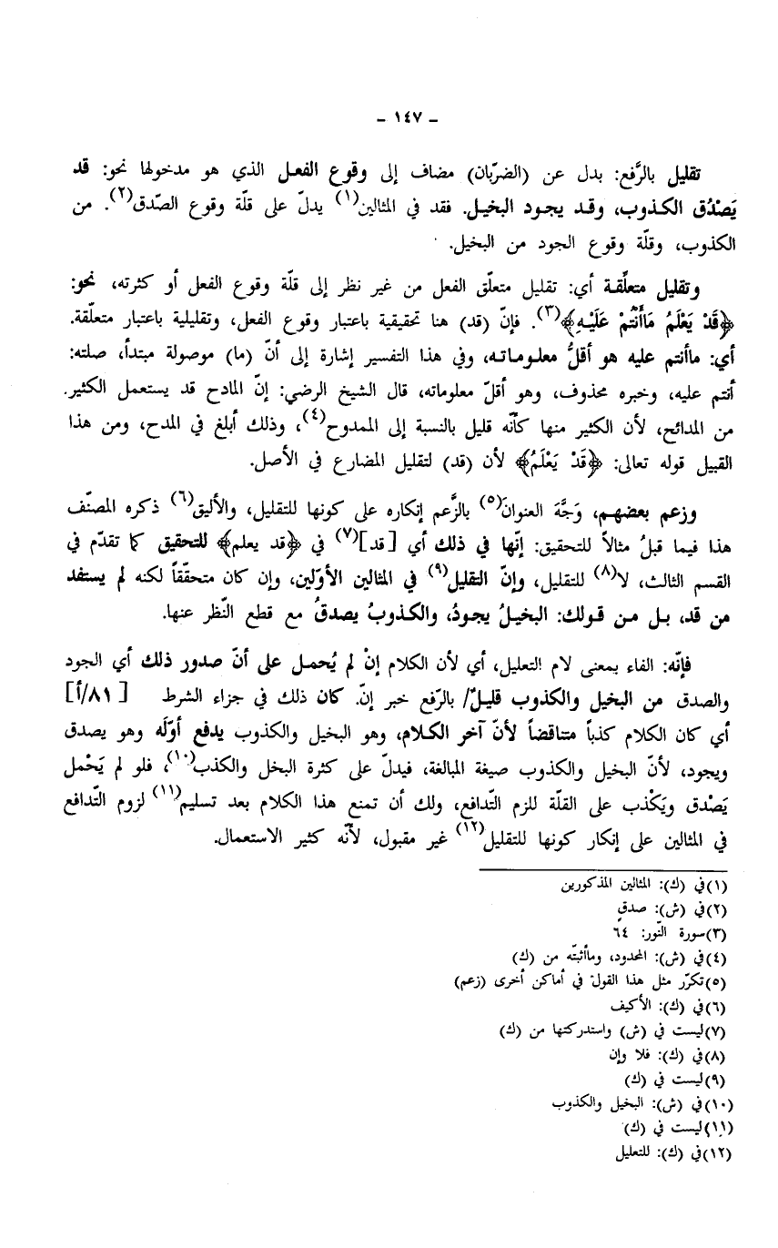 وتقليل متعلِّقة أي: تقليل متعلّق الفعل من غير نظر إلى قلَّة وقوع الفعل أو كثرته، نحو: {قَدْ يَعْلَمُ مَا أَنْتُمْ عَلَيْهِ}. فإنّ (قد) ها تحقيقية باعتبار وقوع الفعل، وتقليلية باعتبار متعلّقة. أي: ما أنتم عليه هو أقلّ معلوماته، وفي هذا التفسير إشارة إلى أن (ما) موصولة مبتدأ، صلته: أنتم عليه، وخبره محذوف، وهو أقل معلوماته، قال الشَّيخ الرضي: إنّ المادح قد يستعمل الكثير. من المدائح، لأنَّ الكثير منها كأنّه قليل بالنسبة إلى الممدوح، وذلك أبلغ في المدح، ومن هذا القبيل قوله تعالى: {قَد يَعْلَمُ} لأنَّ (قد) لتقليل المضارع في الأصل.