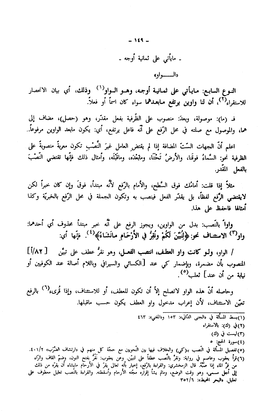 النوع السابع: ما يأتي على ثمانية أوجه، وهو الواو وذلك، أي بيان الانحصار للاستقراء، أن لنا واوين يرتفع ما بعدهما سواء كان اسمًا أو فعلًا.