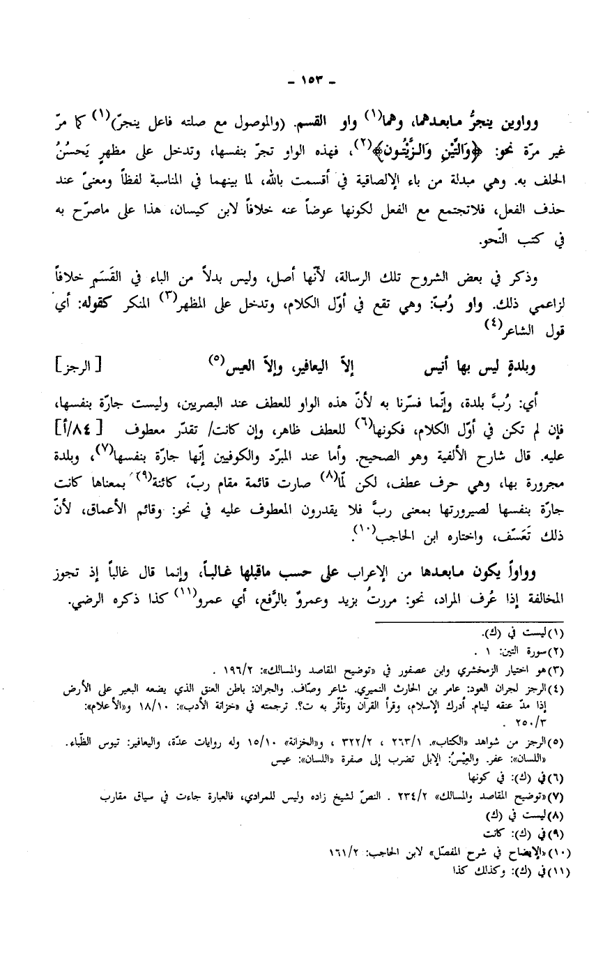 وذكر في بعض الشروح تلك الرسالة، لأنَّها أصل، وليس بدلًا من الباء في القَسَم خلافًا لزاعمي ذلك. واو رُبّ: وهي تقع في أوّل الكلام، وتدخل على المظهر المنكر كقوله: أي قول الشاعر