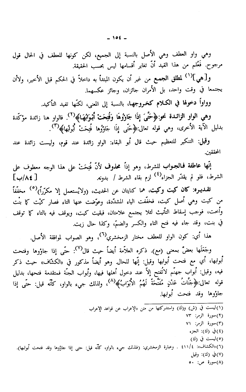 وجَعَلَها بعضٌ بمعنى (مع). ذكره العلامة أيضًا حيث قال: حتَّى إذا جاؤوها وفتحت أبوابها، أي مع فتحت أبوابها وقيل: إنَّها للحال. وهو أيضًا مذكور في "الكشَّاف" حيث ذكر فيه، وقيل: أبواب جهنّم لا تُفتح إلّا عند دخول أهلها فيها، وأبواب الجنَّة فمتقدمة فتحها، بدليل قوله تعالى: {جَنَّاتِ عَدْنٍ مُفَتَّحَةً لَهُمُ الْأَبْوَابُ}، ولذلك جيء بالواو، كأنَّه قيل: حتَّى إذا جاؤوها وقد فتحت أبوابها.
